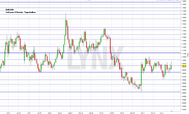 Am Donnerstag werden zunächst um 01:00 Uhr die australischen Inflationserwartungen der Verbraucher für den Januar und die australischen Verkäufe neuer Immobilien im November veröffentlicht. Die britische RICS-Immobilienbilanz für den Dezember folgt um 01:01 Uhr, der japanische Gesamtwirtschaftsindex für den Dezember ist um 05:30 Uhr zu bewerten und um 08:45 Uhr folgt das französische Geschäftsklima für den Januar. Die EZB wird in ihrer Zinsentscheidung um 13:45 Uhr aller Voraussicht nach den Leitzins bei 0,05 Prozent belassen. Eine nochmalige Absenkung des Einlagezinssatzes ist ebenso wenig zu erwarten wie eine Zinserhöhung. Die EZB-Pressekonferenz um 14:30 Uhr wird die Märkte jedoch in Bewegung bringen, vor allem die europäischen Aktien, die Anleihemärkte und die Euro-Währungspaare. In den USA werden zur gleichen Zeit die Erstanträge und fortgesetzten Anträge auf Arbeitslosenhilfe sowie der Philadelphia-Fed-Index des produzierenden Gewerbes für den Januar ausgewiesen. Das Verbrauchervertrauen der Eurozone im Januar wird um 16:00 Uhr publiziert. Der EIA-Ölbericht mit den Rohöllagerbestandsdaten der Woche kommt um 17:00 Uhr. Rund 80 Konzerne berichten von ihren aktuellen Quartalsergebnissen, darunter Alaska Air Group (USA), American Express (USA), E-Trade (USA), Starbucks (USA) und Verizon (USA).