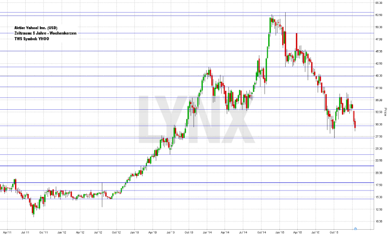 Chart-Bild der Aktie von Yahoo zeigt aktuell einen klaren Abwärtstrend. In der Zeit von 2012 bis Ende 2014 konnte sich der Wert sehr gut entwickeln. Von Tiefstkursen im Bereich von 11,00 US-Dollar ging es hinauf auf über 50,00 US-Dollar. Während dieser Entwicklung boten sich teilweise interessante Einstiegsmöglichkeiten, verbunden einem sehr guten Chance-/ Risikoverhältnis. In den vergangenen 12 Monaten musste der Wert jedoch einen Großteil seiner Gewinne wieder abgeben und rangiert aktuell knapp unter der Marke von 30,00 US-Dollar. Ein Einstieg in die Aktie ist aus charttechnischer Sicht aktuell keine Option. Der Abwärtstrend ist klar ersichtlich und ein Bruch des aktuellen Bewegungstiefs bei rund 27,50 US-Dollar scheint derzeit nicht ausgeschlossen. Eventuell kurzfristig auftretende Erholungen bieten ebenfalls kaum Potenzial für Gewinne. Erst ein nachhaltiges Überschreiten der Marke von 37,00 US-Dollar könnte diese Annahme etwas relativieren und für einen erneuten Aufschwung in Richtung 40,00 US-Dollar oder gar 42,50 US-Dollar sorgen.
