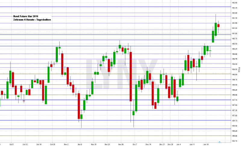 Den DAX erwischte das Börsenjahr 2016 bisher auf dem falschen Fuß – erst eine Intervention von Mario Draghi stoppte die Talfahrt. Über den Berg ist der Gesamtmarkt deshalb aber noch lange nicht. Beim deutschen Leitindex DAX standen am Freitag 9.764,88 Punkte auf der Kurstafel – immer noch ein Minus von 9,10 Prozent seit Jahresanfang. Der XDAX notierte um 22:15 Uhr mit 9.817,05 Punkten etwas höher. An der Wall Street beendete der Dow Jones den Handelstag mit 16.093,51 Punkten, der NASDAQ 100 notierte zum Handelsschluss bei 4.259,773 Punkten und der breit gefasste S&P 500 schloss mit 1.906,90 Zählern. Der Euro notierte nach US-Börsenschluss bei 1,0796 US-Dollar. Eine Feinunze Gold war am Spotmarkt für 1.097,95 US-Dollar zu haben, Rohöl der Nordseesorte Brent kostete zum US-Handelsschluss im März-Kontrakt 32,18 US-Dollar das Fass. Der Euro-Bund-Future notierte am Freitag an der EUREX mit einem Schlusskurs von 161,27 Zählern und erreichte auf Wochensicht ein neues Rekordhoch. Bundesanleihen bis zu einer sechsjährigen Laufzeit rentieren mit einem Negativzins. Die Rendite für zehnjährige Bundesanleihen liegt aktuell bei 0,48 Prozent. Der Spread zwischen zehnjährigen deutschen Bunds und zehnjährigen US-Staatsanleihen (2,05 Prozent Rendite) weitete sich im Vergleich zur Vorwoche von 152 auf 157 Basispunkte. In der neuen Handelswoche emittiert die Finanzagentur des Bundes am 25.01.2016 Geldmarktinstrumente (Bubill) mit einer einjährigen Laufzeit und einem Volumen von 1,5 Mrd. Euro (Neuemission) und am 27.01.2016 Kapitalmarktinstrumente (Bund) mit einer dreißigjährigen Laufzeit und einem Volumen von 1 Mrd. Euro (Aufstockung).