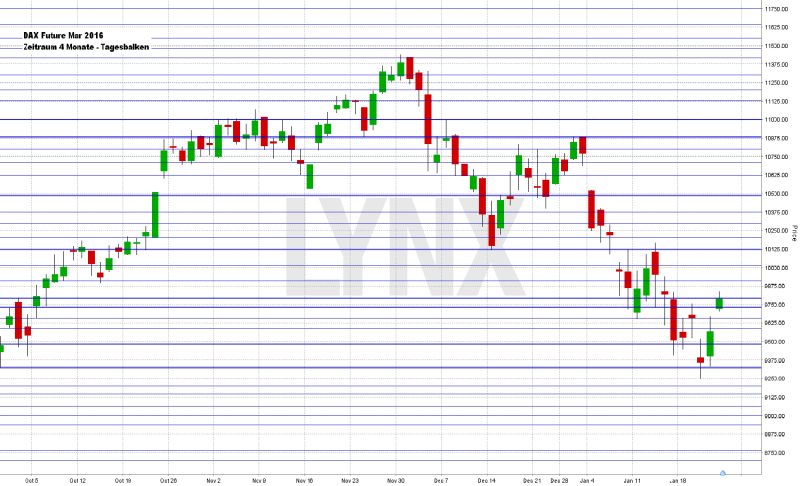 Der DAX markierte am Mittwoch mit 9.314,57 Punkten erneut ein tieferes Zwischentief, nachdem er bereits am 24.08.2015 auf 9.338,20 Punkte und am 29.09.2015 auf 9.325,05 Punkte gefallen war. „Trotz der Verteidigung der 9.300er-Marke – wieder einmal mit EZB-Schützenhilfe – ist die Kuh für 2016 noch nicht vom Eis“, so Dirk Friczewsky, Finanzanalyst für LYNX Broker. „Der DAX kann gut und gerne 2016 eine Handelsspanne von rund 3.000 Punkten aufweisen. Die 8.350 Punkte vom Oktobertief 2014 könnten dabei eine gute Unterstützung sein.“