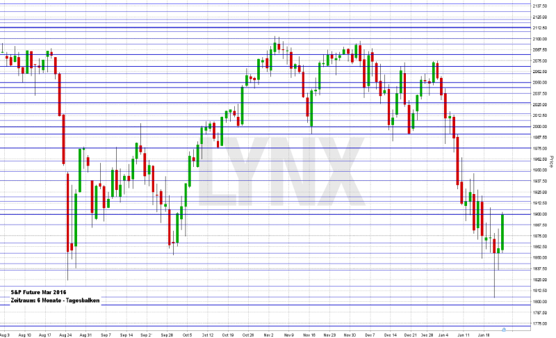 Die Spekulation auf eine Erholung konnte im S&P-Future zu Wochenbeginn zunächst leicht umgesetzt werden, bevor der Kurs am Mittwoch erneut relativ stark einbrach. Bis kurz vor die Marke von 1.800 Punkten rutschte der Markt, um danach bis zum Handelsschluss am Freitag wieder annähernd 100 Punkte zu steigen. Die Wochenschwankung lag somit erneut bei über 100 Punkten. Für die kommende Handelswoche könnte die Analyse der Vorwoche annähernd eins zu eins kopiert werden. Erneut trat mit dem Erreichen des Tiefs kurz vor der Marke von 1.800 Punkten ein auffällig hohes Volumen auf, was an den Märkten oft eine Gegenbewegung hervorruft. Es gilt somit erneut, dass mit einer Erholung zu rechnen ist, obwohl der Trendvorteil aus charttechnischer Sicht weiterhin klar auf der Abwärtsseite liegt. Short-Trades sind somit erlaubt, jedoch sollte ein negatives Feedback schnell zu einer Minimierung der Tradefrequenz führen. Long-Trades sollten eher nicht eingegangen werden.