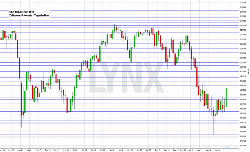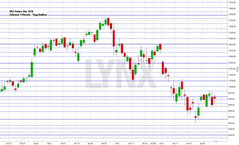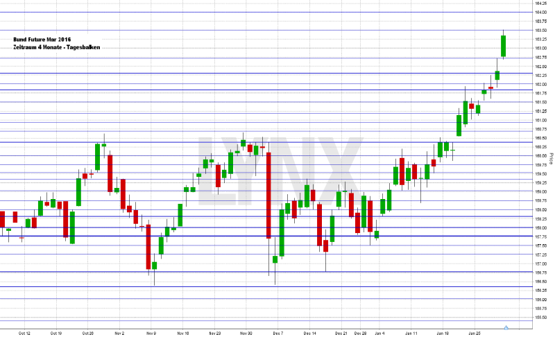 Der deutsche Leitindex beendet den Monat Januar tiefrot. Die bisherige Jahresperformance liegt bei -8,80 Prozent. Beim DAX standen am Freitag 9.798,11 Punkte auf der Kurstafel. Der XDAX stand um 22:15 Uhr bei 9.840,34 Punkten. An der Wall Street beendete der Dow Jones den Handelstag mit 16.466,30 Punkten, der NASDAQ 100 notierte zum Handelsschluss bei 4.279,169 Punkten, der breit gefasste S&P 500 schloss mit 1.940,24 Zählern. Der Euro notierte nach US-Börsenschluss bei 1,0831 US-Dollar. Eine Feinunze Gold war am Spotmarkt für 1.118,21 US-Dollar zu haben, Rohöl der Nordseesorte Brent kostete zum US-Handelsschluss im März-Kontrakt 35,99 US-Dollar das Fass. Der Euro-Bund-Future notierte am Freitag an der EUREX mit einem Schlusskurs von 163,40 Zählern. Die Rendite für zehnjährige Bundesanleihen liegt aktuell bei 0,32 Prozent. Der Spread zwischen zehnjährigen deutschen Bunds und zehnjährigen US-Staatsanleihen (1,92 Prozent Rendite) beträgt derzeit 160 Basispunkte. Bundesanleihen rentieren mittlerweile bis zu einer siebenjährigen Laufzeit mit Negativrenditen (Mitte April 2015 rentierten sogar noch achtjährige Läufer im negativen Terrain). In der neuen Handelswoche begibt die Finanzagentur des Bundes Kapitalmarktinstrumente (Bobl) mit einer fünfjährigen Laufzeit und einem Emissionsvolumen von 5,0 Mrd. Euro (Neuemission).