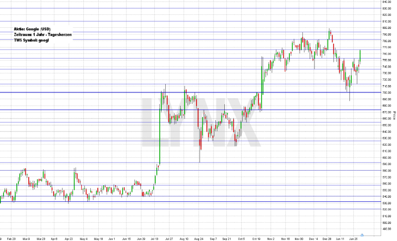 In den vergangenen zwölf Monaten hat sich die Aktie von Alphabet (ISIN: US02079K3059 – Symbol: GOOGL – Währung: US-Dollar) recht gut entwickelt. Von rund 530 US-Dollar ging es im Hoch hinauf bis knapp vor die Marke von 800 US-Dollar, eine prozentuale Entwicklung von rund 50 Prozent. Diverse größere und kleinere Rücksetzer boten immer wieder Einstiegschancen, teilweise mit einem nahezu perfekten Chance- Risiko-Verhältnis. Gerade der Handel mit einem zeitlichen Horizont von nur wenigen Wochen konnte gut Gewinne generieren. Seit Ende des Jahres gab der Wert vom Bewegungshoch bei knapp 800 US-Dollar auf kurzzeitig unter 700 US-Dollar nach und stieg in den vergangenen Handelstagen wieder auf das aktuelle Kursniveau. In der Summe ein guter Wert für das Handeln auf der Long-Seite und auch der derzeitige Blick bleibt weiterhin auf die Long-Seite gerichtet. Oberhalb von 700 US-Dollar sollte der Vorteil auch in den kommenden Wochen und Monaten klar auf der Käuferseite liegen und weitere Hochs oberhalb von 800 US-Dollar sind nicht auszuschließen. Erst ein Unterschreiten der Unterstützung von 700 US-Dollar käme der Long-Seite etwas in die Quere und eine neue Analyse sollte vorgenommen werden. Als potenzielle Einstiegsszenarien könnten kleine Konsolidierungen an Unterstützungen genutzt werden.