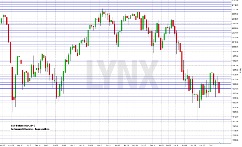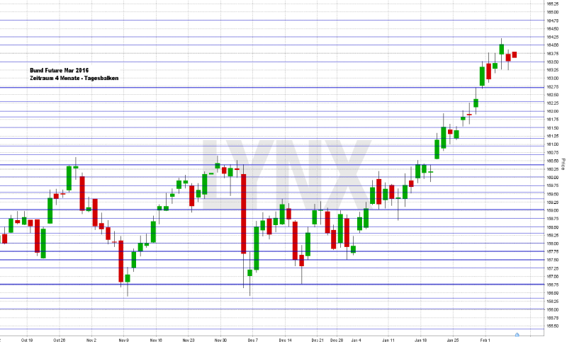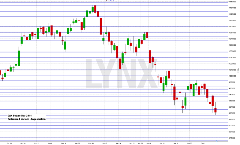 Der DAX fiel bereits am Donnerstag, den 04.02.2016 mit einem Tagestief von 9.270,09 Punkten unter die Unterstützung des letzten Zwischentiefs vom 20.01.2016 bei 9.314,57 Punkten. Am Freitag, den 05.02.2016 sackte der DAX dann nochmals nach unten ab und markierte mit 9.250,84 Indexpunkten ein neues Jahresverlaufstief. Zum Xetra-Schluss standen 9.286,23 Punkte auf der Kurstafel. Der XDAX notierte um 22:15 Uhr bei 9.250,63 Punkten. Der FDAX im Kontraktmonat März fiel auf ein Tagestief von 9.221,00 Punkten und machte damit kurz vor dem Zwischentief vom 16.12.2014 (9.216,50 Punkte) Halt. An der Wall Street beendete der Dow Jones den Handelstag mit 16.204,97 Punkten, der NASDAQ 100 notierte zum Handelsschluss bei 4.024,473 Punkten und der breit gefasste S&P 500 schloss mit 1.880,05 Zählern. Der Euro notierte nach US-Börsenschluss bei 1,1158 US-Dollar. Eine Feinunze Gold war am Spotmarkt für 1.173,40 US-Dollar zu haben, Rohöl der Nordseesorte Brent kostete zum US-Handelsschluss im April-Kontrakt 34,06 US-Dollar das Fass. Der Euro-Bund-Future notierte am Freitag an der EUREX mit einem Schlusskurs von 163,94 Zählern. Bundesanleihen bis zu einer siebenjährigen Laufzeit notieren mit einem Negativzins. Die Rendite für zehnjährige Bundesanleihen liegt aktuell bei 0,29 Prozent. Der Spread zwischen zehnjährigen deutschen Bunds und zehnjährigen US-Staatsanleihen (1,84 Prozent Rendite) liegt damit bei 155 Basispunkten. In der neuen Handelswoche emittiert die Finanzagentur des Bundes am 08.02.2016 Geldmarktinstrumente (Bubill) mit einer sechsmonatigen Laufzeit und einem Volumen von 3,0 Mrd. Euro (Neuemission), am 09.02.2016 Kapitalmarktinstrumente (iBund) mit einer dreißigjährigen Laufzeit und einem Volumen von 0,5 Mrd. Euro (Aufstockung) sowie am 10.02.2016 Kapitalmarktinstrumente (Schatz) mit einer zweijährigen Laufzeit und einem Volumen von 5,0 Mrd. Euro (Neuemission).