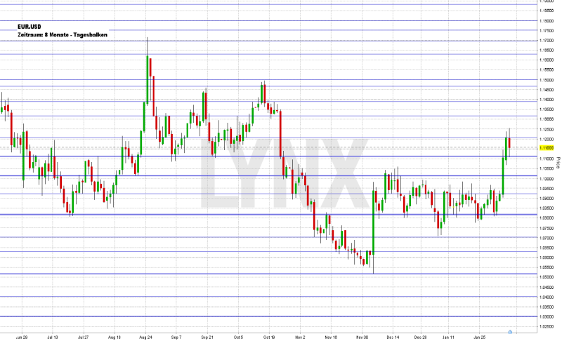 Am Dienstag wendete sich das Blatt beim EUR.USD gravierend. Mit dem Überschreiten der Marke 1,0900 rückte die Long-Seite in den Vordergrund, was gerade am Mittwoch und Donnerstag ideale Trade-Möglichkeiten bot. Im Hoch erreichte das Währungspaar die Marke 1,1250 und überstieg das angenommene Kursziel 1,1000 um Welten. Der Freitagsschlusskurs lag bei gut 1,1150. Durch das starke Momentum der Vorwoche und auch durch das nachhaltige Überschreiten der Widerstände 1,1000 und 1,1100 wurde der EUR.USD jetzt klar in den Long-Modus versetzt. Um diesen beizubehalten, sollte die Unterstützung 1,1000 nicht mehr unterschritten werden – aus kurzfristiger Sicht sollten die Kurse sogar die Unterstützung 1,1100 vorerst nicht nachhaltig unterschreiten. Weitere Hochs sind nicht auszuschließen und die Marken 1,1300 beziehungsweise 1,1350 könnten realistische Ziele sein.