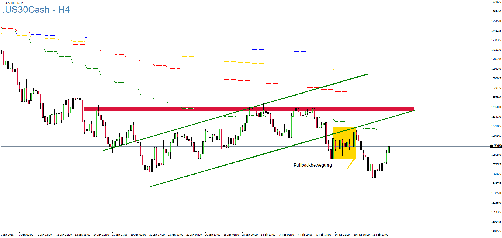 Wie auch der SP500 legte der Dow Jones einen schwachen Start in die vergangen Handelswoche hin. Dabei wurde auch die bullishe Flagge, welche wir in der Analyse vom 08.02. thematisiert haben, gebrochen und der Abwärtstrend setzte sich zunächst fort. Im Anschluss erfolgte eine Pullbackbewegung an die untere Trendlinie der bullishen Flagge, bevor er erneut dynamisch auf das Wochentief bei 15.500 Punkten abfiel (gelbes Rechteck). Von dort setzte eine Erholung zum Wochenschluss ein und der Dow Jones schloss am Freitag nahe seinem Tageshoch bei 15.964 Punkten.