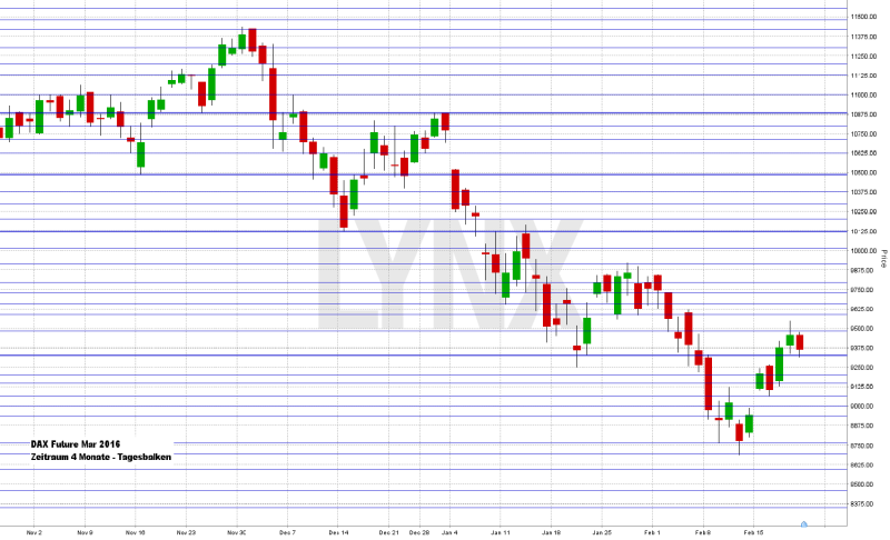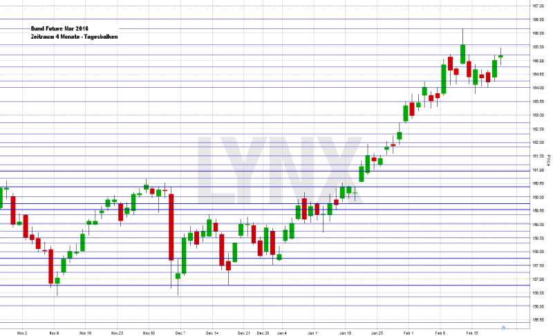 Der deutsche Leitindex DAX vollzog von seinem letzten Verlaufstief am 11.02.2016 bei 8.699,29 Punkten einen Lauf auf ein Zwischenhoch von 9.551,87 Punkten – dies entspricht rund 850 Indexpunkten. Am Freitag ging der DAX mit 9.388,05 Punkten aus dem Xetra-Handel. Der XDAX notierte um 22:15 Uhr bei 9.382,04 Punkten. An der Wall Street beendete der Dow Jones den Handelstag mit 16.391,99 Punkten, die Rekordmarke liegt hier bei 18.351,36 Punkten. Der NASDAQ 100 notierte zum Handelsschluss bei 4.164,088 Punkten. Der breit gefasste S&P 500 schloss mit 1.917,78 Zählern, der Rekord beträgt 2.134,72 Punkte. Der Euro notierte nach US-Börsenschluss bei 1,1130 US-Dollar. Eine Feinunze Gold war am Spotmarkt für 1.226,80 US-Dollar zu haben, Rohöl der Nordseesorte Brent kostete zum US-Handelsschluss im April-Kontrakt 33,01 US-Dollar das Fass. Der Euro-Bund-Future notierte am Freitag an der EUREX mit einem Schlusskurs von 165,06 Zählern. Bundesanleihen bis zu einer achtjährigen Laufzeit notieren mit einem Negativzins. Die Rendite für zehnjährige Bundesanleihen liegt aktuell bei 0,20 Prozent. Der Spread zwischen zehnjährigen deutschen Bunds und zehnjährigen US-Staatsanleihen (1,74 Prozent Rendite) liegt derzeit bei 154 Basispunkten. In der neuen Handelswoche begibt die Finanzagentur des Bundes am 22.02.2016 Geldmarktinstrumente (Bubill) mit einer einjährigen Laufzeit und einem Emissionsvolumen von 1,5 Mrd. Euro (Neuemission) sowie am 24.02.2016 Kapitalmarktinstrumente (Bund) mit einer dreißigjährigen Laufzeit und einem Emissionsvolumen von 1,0 Mrd. Euro (Aufstockung).