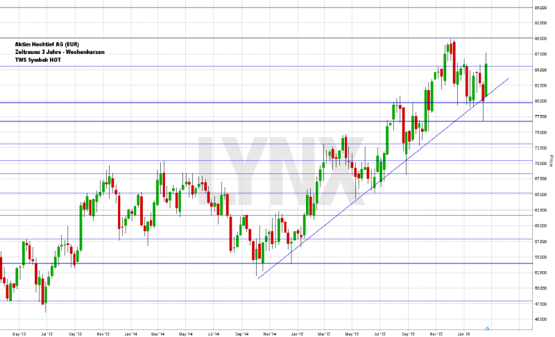 Der Kurs der Hochtief-Aktie verlief in den vergangenen drei Jahren grundsätzlich recht positiv, wobei der Verlauf seit Ende 2014 etwas an Fahrt aufnahm. Von rund 52,50 Euro ging es relativ sauber bis hinauf auf 90,00 Euro, wobei diverse Rücksetzer zu guten Einstiegschancen führten. Nach dem genannten Hoch von 90,00 Euro gab der Wert kürzlich wieder etwas nach und markierte Anfang Februar diesen Jahres ein Zwischentief bei rund 77,00 Euro – um in der vergangenen Woche wieder auf über 85,00 Euro zu steigen. Für weitere Handlungen sollten aktuell zwei Linien im Auge behalten werden. Zum einen zeigte die Vergangenheit, dass die eingezeichnete Trendlinie prinzipiell nicht nachhaltig unterschritten wurde – der Wert blieb sauber im Trend. Zum anderen stellt die Unterstützung von 80,00 Euro einen noch wichtigeren Unterstützungsbereich dar. Kurse darüber könnten weiterhin für diverse Kaufgedanken genutzt werden, wobei neue Hochs als Ziel nicht unrealistisch sind. Ein nachhaltiges Absacken unter die Unterstützung von 80,00 Euro sollte als Warnzeichen gewertet werden und Käufe könnten an Potenzial verlieren.