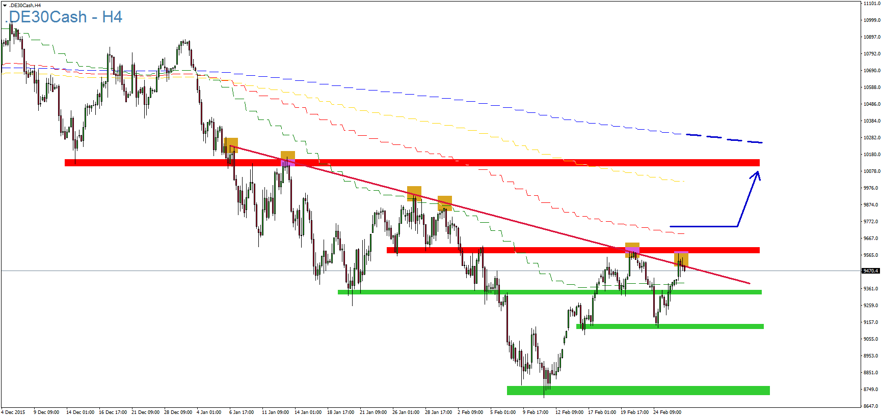 Die bearishe Alternative wäre eine negative Eröffnung am Montag. Dann müsste zumindest der Bereich um 9.430 Punkte gehalten werden. Hier befinden sich das Verlaufshoch vom 24. Februar sowie der Tiefpunkt der Dreiecksformation. Dort besteht abermals die Möglichkeit den Aufwärtstrend fortzusetzen.