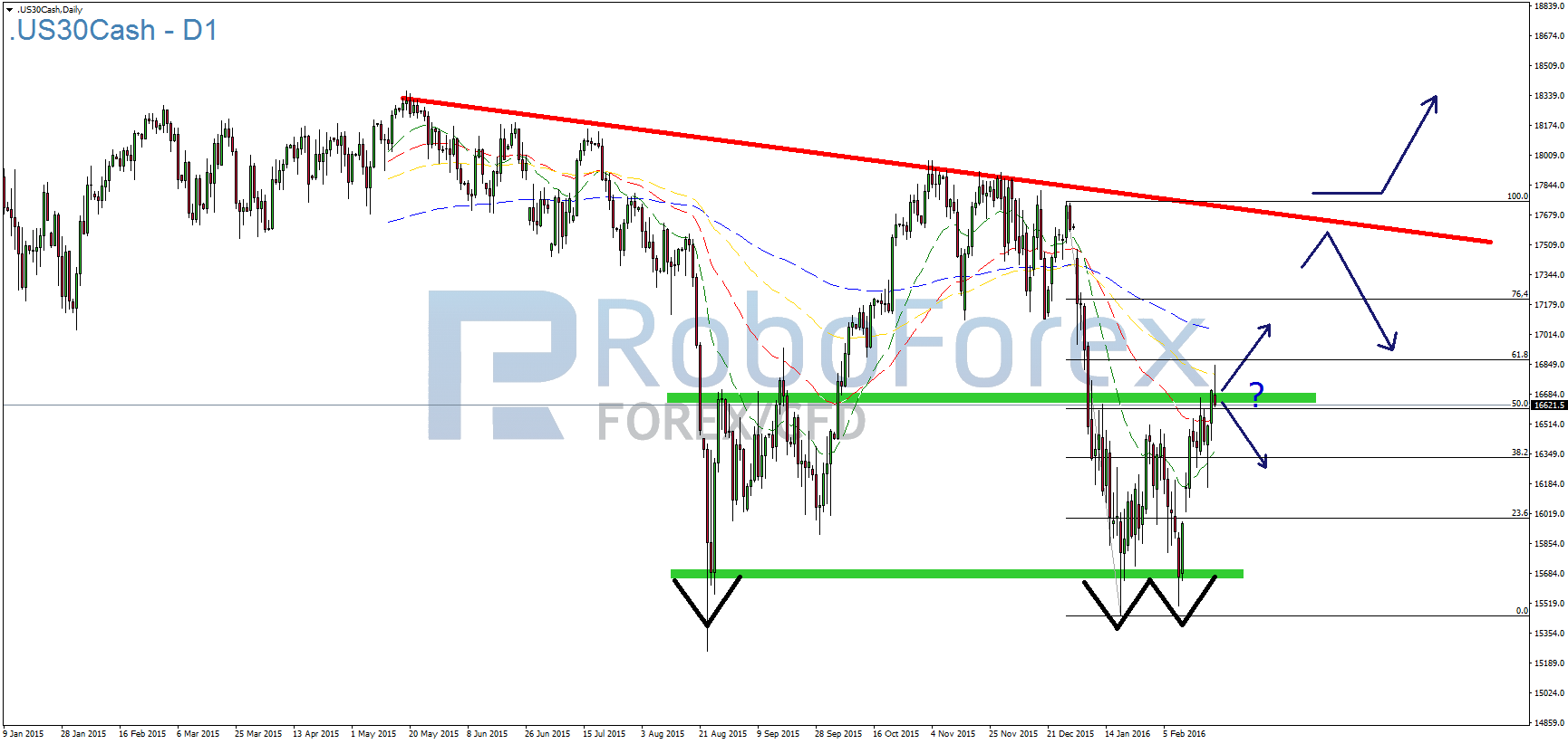 Wir sehen, dass der DOW Jones auf Tagesbasis bei 15.500 Punkten einen dreifachen Boden ausgebildet hat. Von dort wurde auch die derzeitige Rallybewegung gestartet, die uns aktuell an den wichtigen Widerstand bei 16.650 Punkten geführt hat. In diesem Bereich kam es in der Vergangenheit entweder zu Rücksetzern oder nach dem Durchbruch im Oktober 2015 zu einer dynamischen Fortsetzung der Aufwärtsbewegung an die rote Abwärtstrendlinie.