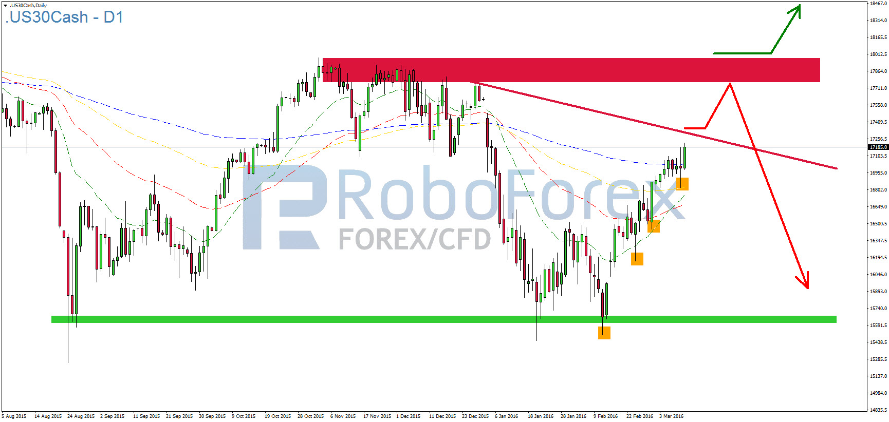 Nach einem Bruch der Abwärtstrendlinie würde der Bereich zwischen 17.740 und 17.975 Punkten in den Fokus der Anleger rücken. In diesem Bereich befinden sich die vorangehenden Hochpunkte im übergeordneten Abwärtstrend. Erst wenn dieser Bereich überschritten werden kann, würde die Gefahr der drohenden Topbildung massiv abgeschwächt werden und nachhaltig steigende Kurse wären wieder möglich. Bis dahin hat der DOW Jones aber noch eine Strecke von mindestens 800 Punkte zurückzulegen.