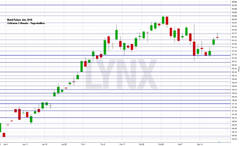 Mehrfach wurden die 10.000 Punkte getestet und oft überschritten, doch nachhaltig konnte sich der deutsche Leitindex DAX noch nicht oberhalb dieser so wichtigen Marke festsetzen. Da halfen selbst die nochmals gigantischen Maßnahmen Draghis und auch das zaghafte Festhalten der Fed am derzeitigen Niedrigzins sowie eine gesenkte Projektion für die US-Zinsanhebungen in naher Zukunft nicht viel. Die Nervosität, Volatilität und Ungewissheit am Markt bleiben derzeit groß. Neben dem so wichtigen EU-Türkei-Gipfel sorgte auch der Hexensabbat an der EUREX für Volatilität und hohe Handelsvolumina. Allein beim DAX lag das Handelsvolumen am Freitag bei 8.494.747.679,00 Euro und damit rund doppelt so hoch wie gewöhnlich. Zum Xetra-Schluss standen am Freitag 9.950,80 Punkte auf der Kurstafel. Der XDAX stand um 22:15 Uhr bei 9.947,76 Punkten. Der Future-DAX (FDAX) im neuen Juni-Kontrakt ging an der EUREX mit 9,981.50 Punkten aus dem Handel – er kratzte intraday beinahe die 10.000-Punkte-Marke. An der Wall Street beendete der Dow Jones den Freitag mit 17.602,30 Punkten, die Rekordmarke liegt bei 18.351,36 Punkten. Der NASDAQ 100 notierte zum Handelsschluss bei 4.410,828 Punkten. Der breit gefasste S&P 500 schloss mit 2.049,58 Zählern, der Rekord beträgt 2.134,72 Punkte. Der Euro notierte nach US-Börsenschluss bei 1,1270 US-Dollar. Eine Feinunze Gold war am Spotmarkt für 1.255,40 US-Dollar zu haben, Rohöl der Nordseesorte Brent kostete zum US-Handelsschluss im Mai-Kontrakt 41,20 US-Dollar das Fass. Der Euro-Bund-Future notierte am Freitag an der EUREX mit einem Schlusskurs von 162.61 Zählern. Die Rendite für zehnjährige Bundesanleihen liegt aktuell bei 0,21 Prozent. Der Spread zwischen zehnjährigen deutschen Bunds und zehnjährigen US-Staatsanleihen (1,87 Prozent Rendite) liegt derzeit bei 166 Basispunkten. Bundesanleihen rentieren bis zu einer achtjährigen Laufzeit mit Negativrenditen. In der neuen Handelswoche begibt die Finanzagentur des Bundes am 21.03. Geldmarktinstrumente (Bubill) mit einer einjährigen Laufzeit und einem Emissionsvolumen von 1,5 Mrd. Euro (Neuemission) sowie am 23.03. Kapitalmarktinstrumente (Bund) mit einer dreißigjährigen Laufzeit und einem Volumen von 1,0 Mrd. Euro (Aufstockung).