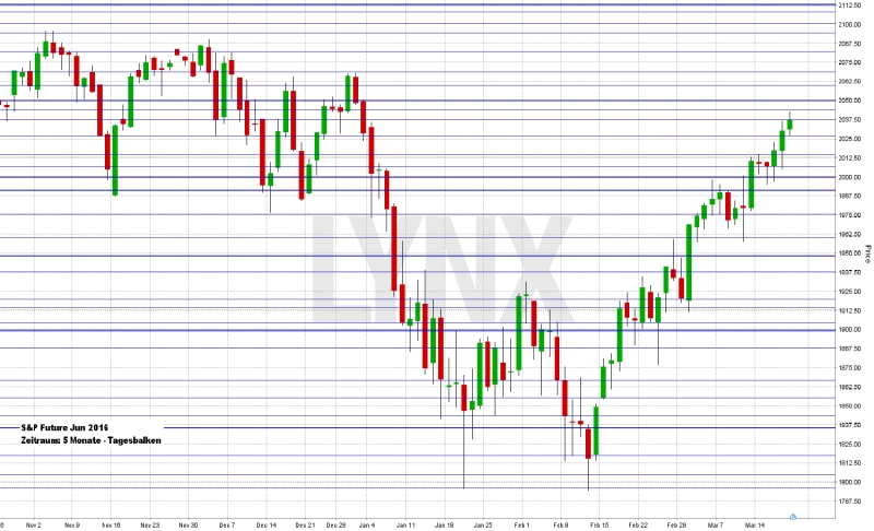Der Markt startete am Montag und Dienstag der vergangenen Woche verhalten in den Handel und der S&P-Future sackte kurzzeitig unter die Unterstützung von 2.000 Punkten. Ab Mittwoch zeigte sich die Stärke der Vorwochen jedoch erneut und ein Wochenhoch von gut 2.040 Punkten wurde erreicht. Der Markt ist auch in der kommenden Woche von der Long-Seite aus zu betrachten. Kurse oberhalb von 2.000 Punkten sind aus charttechnischer Sicht long. Das Ziel 2.050 ist durchaus realistisch, wobei zu beachten ist, dass die Widerstände bei 2.050 und 2.060 Punkten relativ stark sind und gegebenenfalls zu etwas größeren Rücksetzern führen könnten.