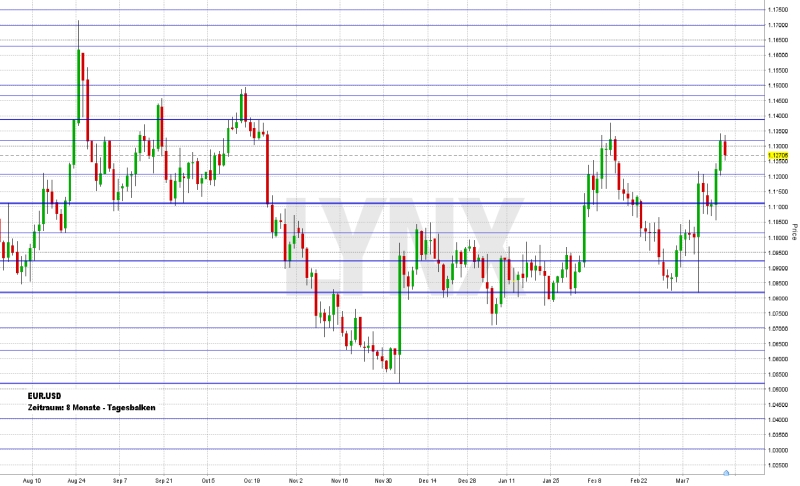 Der EUR.USD ermöglichte in der vergangenen Handelswoche optimale Trades in Richtung der Wochenziele 1,1250 und 1,1300. Nach einem etwas zaghaften Wochenstart und einem kurzen Ausflug unter die Unterstützung 1,1100 stieg der Markt ab Mittwoch direkt bis zu den Wochenzielen. Der Schlusskurs von Freitagabend lag im Bereich 1,1270. Aus einer etwas kurzfristigeren Sicht sollten Kurse oberhalb von 1,1200 weiterhin klar long sein. Mittelfristig sind sogar Kurse über der Unterstützung 1,1100 weiterhin charttechnisch long. Das Erreichen des Hochs von Mitte Februar ist durchaus realistisch, was zu einem Wochenziel von 1,1400 führt. Die Abwärtsseite ist aus aktueller Sicht uninteressant.