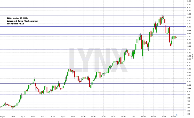 In den vergangenen drei Jahren hat sich die Aktie von Nordex mehr als positiv entwickelt. Von rund 5,00 Euro stieg sie bis Ende 2015 auf knapp 34,00 Euro, was einer prozentualen Entwicklung von rund 600 Prozent entspricht. Seit Anfang diesen Jahres ließ sie jedoch etwas Federn und sackte kürzlich bis auf unter 22,00 Euro ab, was den Aufwärtstrend aus charttechnischer Sicht vorerst beendete. In den letzten fünf Wochen erholte sich der Wert auf knapp 28,00 Euro. Am vergangenen Freitag schloss er bei rund 26,50 Euro. Die Long-Seite ist vorerst charttechnisch nachteilig, Kaufzurückhaltung ist ratsam und ein erneuter Fall in Richtung 23,00 Euro ist nicht auszuschließen. Erst ein Schub über den Widerstand von 30,00 Euro sollte der Aktie wieder etwas Kraft verleihen, um das alte Hoch erneut erklimmen zu können.