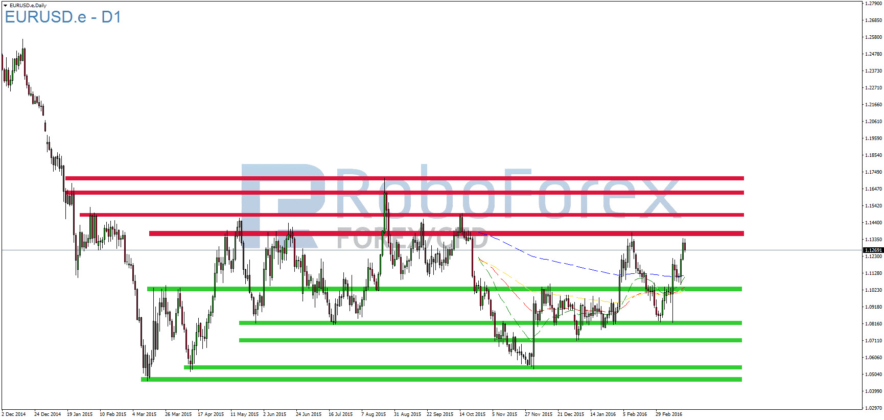 Im Tageschart sind die wichtigen Unterstützungen innerhalb der derzeit aktiven Seitwärtsphase eingezeichnet. Unterstützungen sind dabei in grün und Widerstände in rot eingezeichnet. Anhand des Tagescharts lässt sich erkennen, dass das Währungspaar EUR/USD derzeit übergeordnet seitwärts verläuft. Trotz der positiven Entwicklung in den vergangenen Tagen bleibt festzuhalten, dass der Euro noch einige wichtige Widerstände zu überwinden hat, bevor die technische Analyse weitere Aufwärtsbewegungen prognostizieren kann. Ein erster wichtiger Widerstand verläuft bei 1.1375 und konnte in der vergangenen Woche noch nicht überwunden werden.