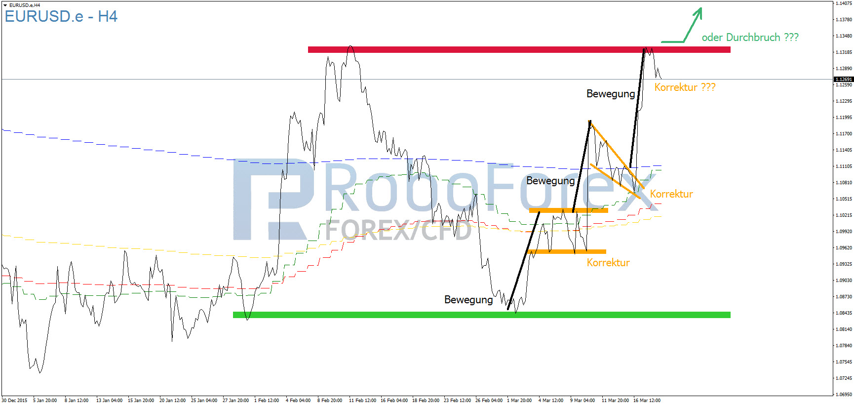 Die seit Anfang März bestehende Aufwärtsbewegung lässt sich im H4-Linienchart optimal in einen Ablauf von Bewegung und Korrektur unterteilen. Zunächst konnte der Euro zu Beginn des Monats eine dynamische Aufwärtsbewegung verzeichnen, bevor diese durch eine Seitwärtsrange korrigiert wurde. Diese Seitwärtsphase konnte dann im Rahmen der EZB-Entscheidung bullish aufgelöst werden. Auf diese Bewegung folgte eine erneute Korrektur in Form einer Keilformation. Am vergangenen Donnerstag erfolgte dann die dritte Aufwärtsbewegung. Diese wurde vornehmlich durch die Aussichten des FED auf die kommenden Zinserhöhungen ausgelöst. Kurz vor dem eingezeichneten Widerstandsbereich und dem Monatshoch aus Februar bei 1.1375 fand diese Aufwärtsbewegung allerdings ein Ende.