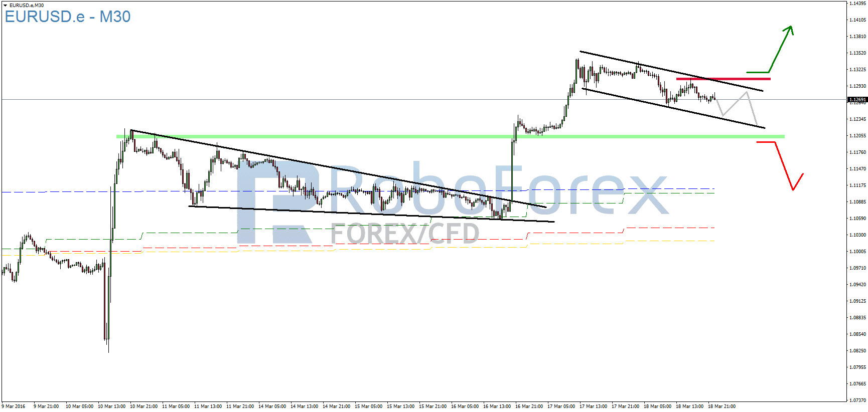 Der M30-Chart verdeutlicht, dass das Devisenpaar zum Wochenausklang bereits korrektiven Charakter angenommen hat. Dass die Volatilität zum Wochenschluss abnimmt ist nach der FED-Zinsentscheidung aber nicht unüblich. Daher ist die zeitige Fortsetzung der Aufwärtsbewegung bzw. die Ausbruchsbewegung im o.a. H4-Chart ein attraktives Szenario für den Beginn der kommenden Handelswoche.