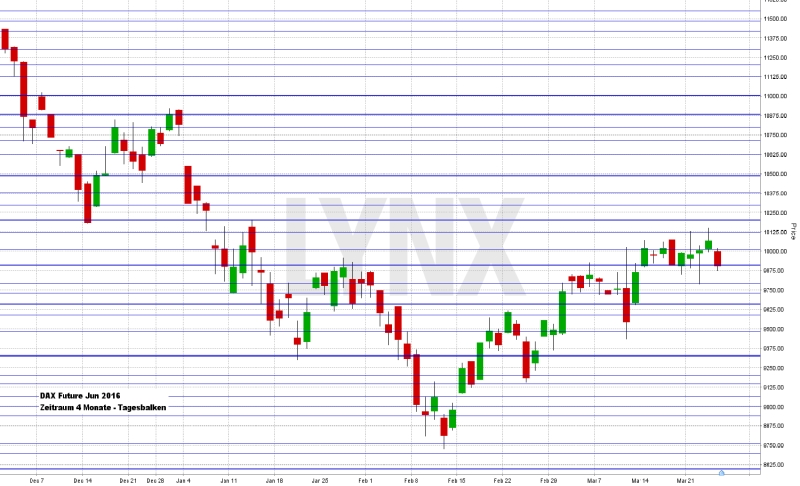 Der DAX verlor am Gründonnerstag mit einem Minus von 1,71 Prozent im Vergleich zu seinen US-Pendants Dow Jones, NASDAQ 100 und S&P 500 sehr stark. Die US-Kernmärkte gingen beinahe unverändert ins Osterwochenende. Nach fünf grünen Wochenkerzen erfolgte jedoch vor dem verlängerten Wochenende die Gewinnmitnahme. Beim deutschen Leitindex DAX standen am Freitag 9.851,35 Punkte auf der Kurstafel. Der XDAX stand um 22:15 Uhr bei 9.894,03 Punkten. An der Wall Street beendete der Dow Jones den Handelstag mit 17.515,73 Punkten, die Rekordmarke liegt bei 18.351,36 Punkten. Der NASDAQ 100 notierte zum Handelsschluss bei 4.405,532 Punkten. Der breit gefasste S&P 500 schloss mit 2.035,94 Zählern, der Rekord beträgt 2.134,72 Punkte. Der Euro notierte nach US-Börsenschluss bei 1,1167 US-Dollar. Eine Feinunze Gold war am Spotmarkt für 1.217,05 US-Dollar zu haben, Rohöl der Nordseesorte Brent kostete zum US-Handelsschluss im Mai-Kontrakt 40,44 US-Dollar das Fass. Der Euro-Bund-Future notierte am Freitag an der EUREX mit einem Schlusskurs von 163,04 Zählern. Die Rendite für zehnjährige Bundesanleihen liegt aktuell bei 0,18 Prozent. Der Spread zwischen zehnjährigen deutschen Bunds und zehnjährigen US-Staatsanleihen (1,90 Prozent Rendite) liegt derzeit bei 172 Basispunkten. Bundesanleihen rentieren bis zu einer achtjährigen Laufzeit negativ. In der neuen Handelswoche begibt die Finanzagentur des Bundes Kapitalmarktinstrumente (Bobl) mit einer fünfjährigen Laufzeit und einem Emissionsvolumen von 4,0 Mrd. Euro (Aufstockung). Am Ostermontag wurde unter anderem an den Aktien-, Anleihen-, Devisen- und Rohstoffmärkten in den USA gehandelt – alle Kursdaten stammen vom Wochenschluss.