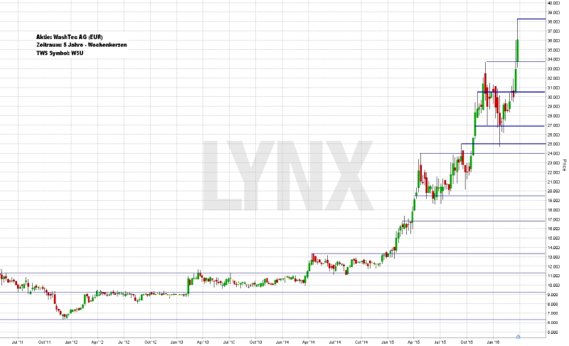 Die Aktie der WashTec AG hat sich in den vergangenen Jahren sehr gut entwickelt. Vom Tief Ende 2012 im Bereich 6,50 Euro ging es kürzlich hinauf auf knapp über 38,00 Euro. Gerade ab Anfang 2015 nahm die Aufwärtsbewegung etwas Schwung auf und bei gleichzeitig ansteigender Volatilität konnten starke Gewinne eingefahren werden. Charttechnisch ist die Aufwärtsbewegung bis dato sehr sauber. Auch für die kommenden Wochen sollte die Aufwärtsseite weiterhin die Oberhand behalten, da der Aufwärtstrend mit steigenden Hochs und steigenden Tiefs sauber intakt ist. Weitere neue Hochs sind daher nicht auszuschließen. Erst ein Unterschreiten der Unterstützung bei 30,50 Euro wäre das erste Anzeichen einer eventuellen größeren Korrektur und Käufe sollten in diesem Fall etwas zurückgenommen werden. Ein nachhaltiges Unterschreiten der Marke von 25,00 Euro wäre ein charttechnischer Bruch des Aufwärtstrends und eine neue Analyse wäre von Vorteil.