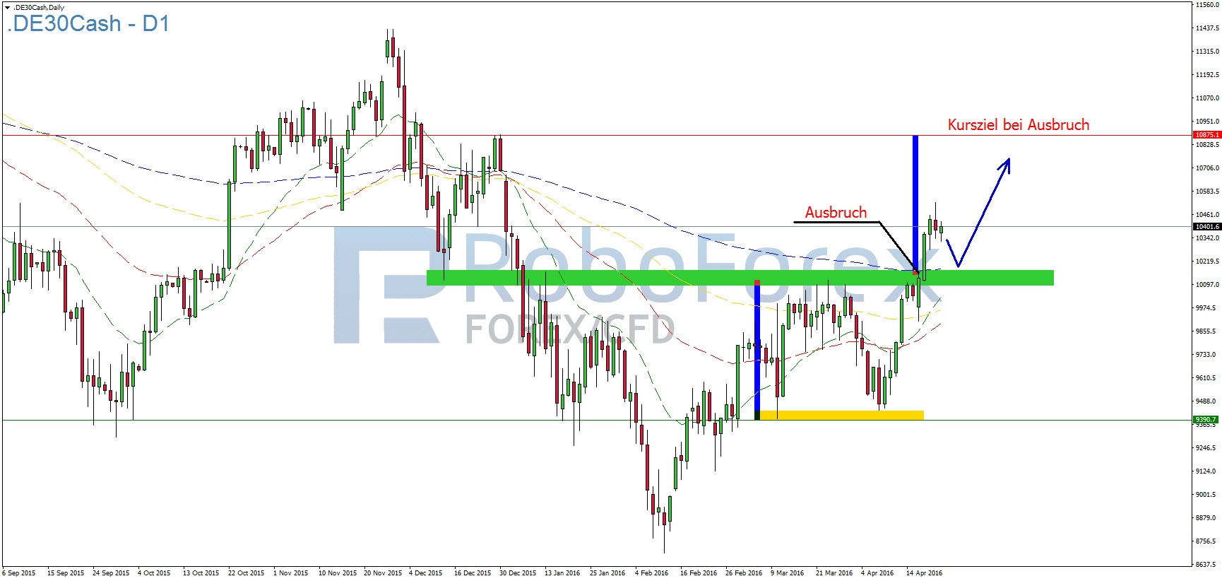 Für einen eventuellen Ausbruch ist bereits das Kursziel bei 10.875 Punkten beschrieben worden. Durch den bullishen Ausbruch in der vergangenen Handelswoche ist dieses Kursziel nun aktiviert worden und eine Abarbeitung dieses Kursziels in den kommenden Tagen und Wochen ist durchaus wahrscheinlich. Denkbar ist allerdings zunächst ein Pullback an die 200er-EMA. Dieser Pullback könnte bisher nichtinvestierten Anlegern nochmals die Chance für einen Einstieg oder einen Ausbau der derzeit laufenden Positionen bieten.