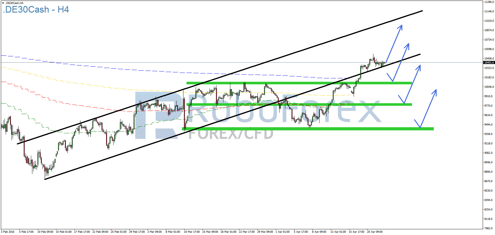 Im H4-Chart wird deutlich, dass der DAX sich wieder in den Aufwärtstrendkanal zurückkämpfen konnte. Zum Wochenschluss am Freitag wurde die untere Trendkanalbegrenzung auch sogleich erneut getestet.