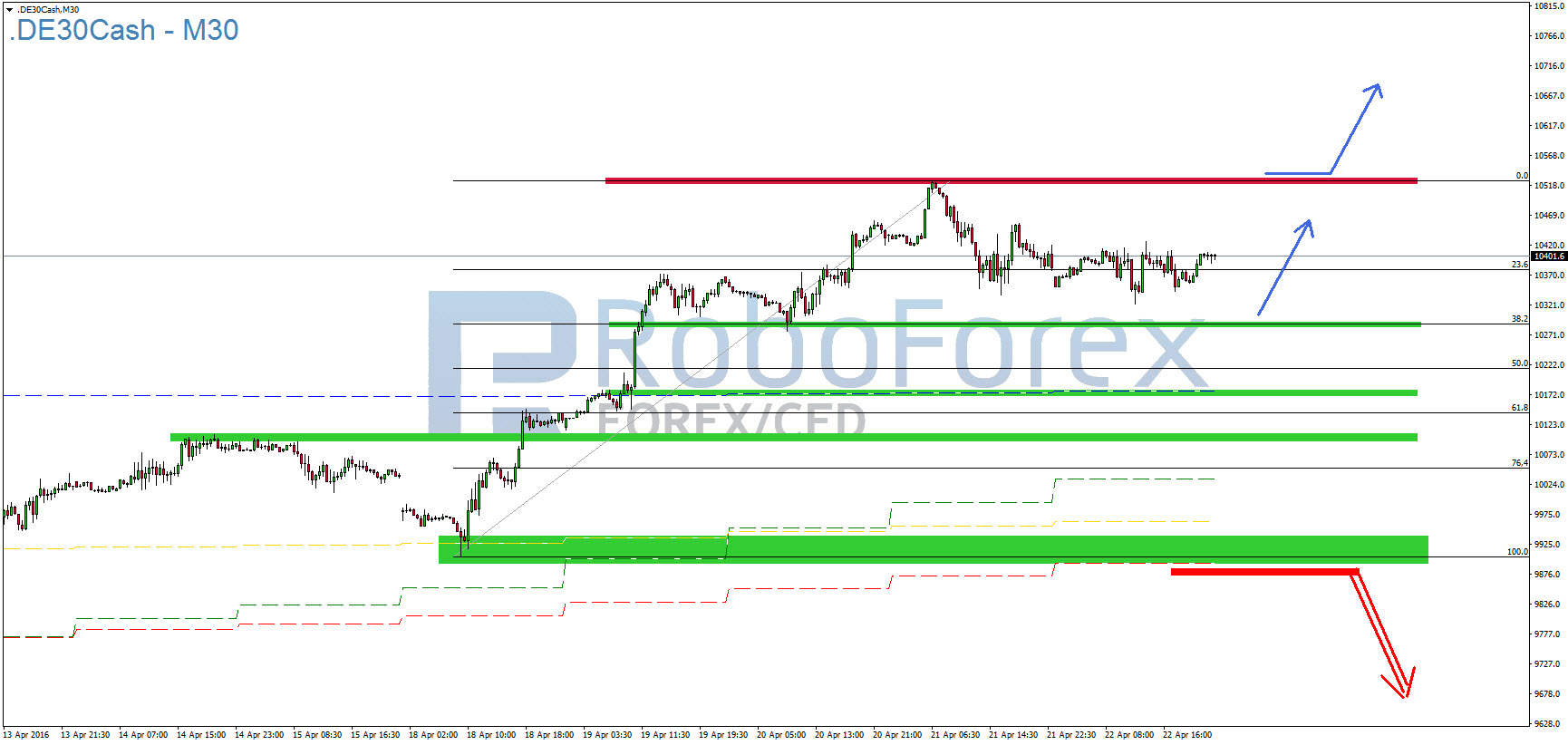 Im kurzfristigen M30-Chart lässt sich eine eingeleitete Seitwärtsphase des deutschen Leitindex erkennen. Diese Seitwärtsrange würde erst über dem Vorwochenhoch bei 10.520 Punkten bullish aufgelöst werden. Auf der Unterseite bieten die Marke bei 10.300 Punkten sowie die 200er-EMA erste Unterstützungen. Solange diese Marken verteidigt werden können bleibt das bullishe Marktmuster beim DAX intakt. Erst bei einem Rückfall unter 9.900 Punkten würde sich das Chartbild auf den unteren Trendstufen eintrüben.