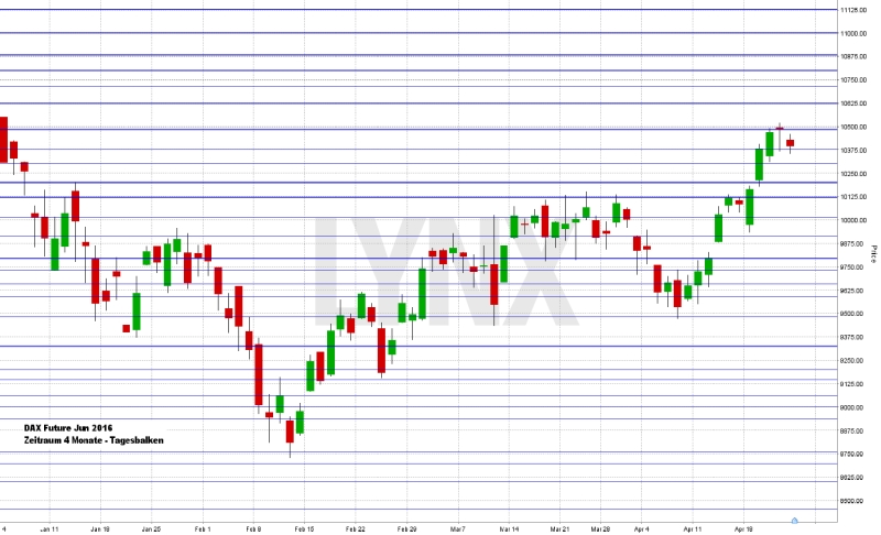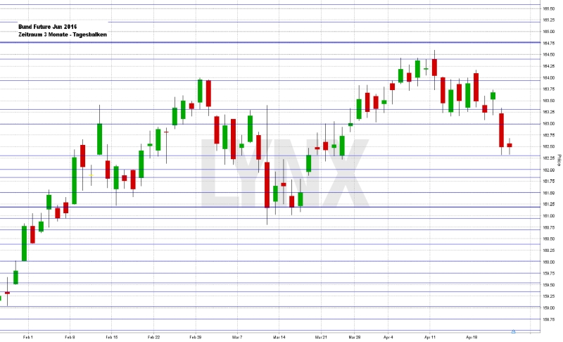 Der DAX dreht ganze 11 Punkte vor Erreichen der unteren Kante der Kurslücke zum Jahreswechsel wieder ins Minus und verpasst damit das erste neue Jahreshoch. Mehrere Tage lang ließ die EZB-Sitzung die Kurse klettern und der DAX stieg im Verlauf der Handelswoche kräftig an, um jetzt nach Veröffentlichung der Fakten wieder leicht abverkauft zu werden – getreu dem Börsenmotto „buy the rumour – sell the fact“. Der deutsche Leitindex ging am Freitag mit 10.373,49 Punkten aus dem Xetra-Handel. Der XDAX stand um 22:15 Uhr bei 10.403,84 Punkten. An der Wall Street beendete der Dow Jones den Handelstag mit 18.003,75 Punkten, die Rekordmarke liegt bei 18.351,36 Punkten. Der NASDAQ 100 notierte zum Handelsschluss bei 4.474,192 Punkten. Der breit gefasste S&P 500 schloss mit 2.091,58 Zählern, der Rekord beträgt 2.134,72 Punkte. Der Euro tendierte nach US-Börsenschluss schwächer bei 1,1222 US-Dollar. Eine Feinunze Gold war am Spotmarkt für 1.233,03 US-Dollar zu haben, Rohöl der Nordseesorte Brent kostete zum US-Handelsschluss im Juni-Kontrakt 45,11 US-Dollar das Fass. Der Euro-Bund-Future notierte am Freitag an der EUREX mit einem Schlusskurs von 162,59 Zählern. Die Rendite für zehnjährige Bundesanleihen liegt aktuell bei 0,23 Prozent. Der Spread zwischen zehnjährigen deutschen Bunds und zehnjährigen US-Staatsanleihen (1,89 Prozent Rendite) liegt derzeit bei 166 Basispunkten. Bundesanleihen rentieren bis zu einer achtjährigen Laufzeit mit Negativrenditen. In der neuen Handelswoche begibt die Finanzagentur des Bundes am Montag, den 25.04.2016 Geldmarktinstrumente (Bubill) mit einer einjährigen Laufzeit und einem avisierten Volumen von 1,5 Mrd. Euro (Neuemission) und am Mittwoch, den 27.04.2016 Kapitalmarktinstrumente (Bund) mit einer dreißigjährigen Laufzeit und einem Emissionsvolumen von 1,0 Mrd. Euro (Aufstockung).
