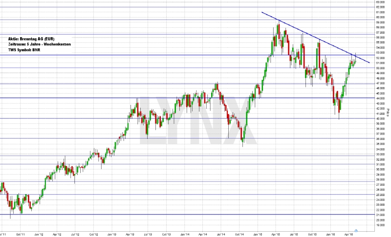 Die Aktie der Brenntag AG hat sich in den vergangenen Jahren recht gut entwickelt. Allerdings wurden trendfolgende Ansätze auf der Long-Seite im zweiten Halbjahr 2014 und ab April 2015 von Kursrückgängen unterbrochen. Von 2011 an ging es zunächst von rund 20,00 Euro hinauf auf gut 47,00 Euro. Ab dort fiel der Wert das erste Mal etwas stärker bis auf unter 35,00 Euro. Ein erneuter Anstieg führte knapp unter die Marke von 60,00 Euro, wo dann eine zweite Abwärtswelle einsetzte, diesmal in Richtung 40,00 Euro. Ein bisher recht starkes Jahr 2016 ließ den Kurs in den aktuellen Bereich von gut 50,00 Euro steigen. Wie in der Grafik eingezeichnet, steht der Wert charttechnisch jetzt an einer entscheidenden Marke. Sollten die eingezeichnete Abwärtstrendlinie und gleichzeitig der Widerstand bei 52,50 Euro nachhaltig überschritten werden, so wäre ein weiterer Anstieg in Richtung 57,00 Euro durchaus realistisch. Kurse unter diesen Bereichen sind für die Käuferseite nicht unbedingt von Vorteil und auf Käufe sollte vorerst verzichtet werden. Lediglich ein Rücksetzer an die Unterstützung 47,00 Euro könnte eventuell für einen Versuch ausgenutzt werden, eine vorherige erneute Analyse wäre jedoch von Vorteil.