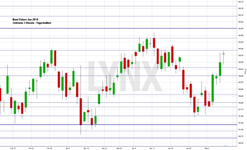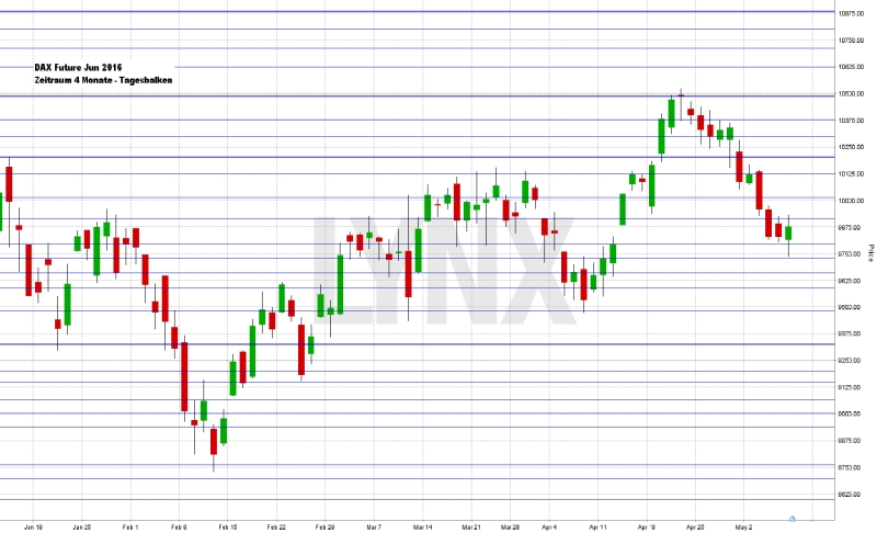 Der deutsche Leitindex DAX verharrt auf 2016er-Basis weiter deutlich im Minus, derzeit beläuft sich die Jahres-Performance auf -9,6 Prozent. Der Monat Mai gilt nicht gerade als gewinnträchtig und auch der nächste US-Zinsschritt (ob jetzt im Juni oder im September) sowie die US-Wahlen im November sind weitere Unwägbarkeiten. Ein Schließen der Kurslücke vom Jahresanfang sollte dennoch nicht komplett ad acta gelegt werden. Beim DAX standen per Xetra-Schluss 9.851,86 Punkte auf der Kurstafel. Der XDAX notierte dann um 22:15 Uhr mit 9.837,25 Punkten. An der Wall Street beendete der Dow Jones den Handelstag mit 17.651,26 Punkten, die Rekordmarke liegt hier bei 18.351,36 Punkten. Der NASDAQ 100 notierte zum Handelsschluss bei 4.312,01 Punkten. Der breit gefasste S&P 500 schloss mit 2.050,63 Zählern, der Rekord beträgt 2.134,72 Punkte. Der Euro notierte nach US-Börsenschluss bei 1,1405 US-Dollar. Eine Feinunze Gold war am Spotmarkt für 1.279,35 US-Dollar zu haben, Rohöl der Nordseesorte Brent kostete zum US-Handelsschluss im Juli-Kontrakt 45,01 US-Dollar das Fass. Der Euro-Bund-Future notierte am Donnerstag an der EUREX mit einem Schlusskurs von 163,82 Zählern. Bundesanleihen bis zu einer achtjährigen Laufzeit notieren mit einem Negativzins. Die Rendite für zehnjährige Bundesanleihen liegt aktuell bei 0,26 Prozent. Der Spread zwischen zehnjährigen deutschen Bunds und zehnjährigen US-Staatsanleihen (0,15 Prozent Rendite) liegt derzeit bei 160 Basispunkten. In der neuen Handelswoche begibt die Finanzagentur des Bundes am Montag, den 09.05.2016 Geldmarktinstrumente (Bubill) mit einer sechsmonatigen Laufzeit und einem Emissionsvolumen von 3,0 Mrd. Euro (Neuemission), am Dienstag, den 10.05.2016 Kapitalmarktinstrumente (iBund) mit einer Laufzeit bis April 2030 und einem Emissionsvolumen von 1,0 Mrd. Euro (Aufstockung) und am Mittwoch, den 11.05.2016 Kapitalmarktinstrumente (Schatz) mit einer zweijährigen Laufzeit und einem Emissionsvolumen von 5,0 Mrd. Euro (Neuemission).