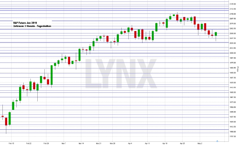 Am Montag behielten beim S&P-Future noch die Bullen die Oberhand und Käufe konnten mit einem kleinen Gewinn beendet werden. Am Dienstag setzte dann jedoch eine leichte Abwärtswelle ein. Der Bruch der Unterstützung bei 2.062,50 Punkten löste einen Short-Trade in Richtung 2.025 Punkte aus. Da das Wochentief nur knapp über diesem Niveau lag, das wir auch als Wochenziel angepeilt hatten, konnte die Position mit gut 20 Punkten Gewinn geschlossen werden. Der Bereich zwischen 2.025 und 2.062,50 Punkten stellt sich weiterhin als eine Seitwärtsphase dar, in welcher in den kommenden Handelstagen nur bedingt gehandelt werden sollte. Ein ausnutzbarer Vorteil ist hier derzeit nicht zu erkennen. Erst Kurse oberhalb dieses Bereichs könnten erneut zu Chancen auf der Long-Seite führen und etwaige Kurse unterhalb für einen Rutsch in Richtung 2.000 Zähler.