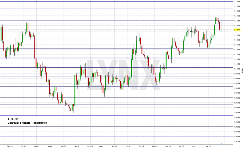 Der Donnerstag beginnt mit dem neuseeländischen Business-Einkaufsmanagerindex für den April um 00:30 Uhr und den neuseeländischen Lebensmittelpreisen für den April. Um 01:50 Uhr werden April-Daten zur japanischen Kreditvergabe sowie Leistungs- und Handelsbilanz veröffentlicht. Die neuen chinesischen Kredite und Daten zur chinesischen Geldmenge M2 im April stehen um 04:00 Uhr zur Bewertung an, um 07:00 Uhr folgt das japanische Eco-Watchers-Sentiment (Umfrage April). Die europäische Session beginnt um 08:45 Uhr mit den französischen Verbraucherpreisen für den April und setzt sich um 11:00 Uhr mit März-Daten zur Industrieproduktion der Eurozone fort. Das Highlight des Handelstages ist der Leitzinsentscheid der Bank of England (BoE) um 13:00 Uhr. Es ist nicht mit einer Veränderung zu rechnen – der Zins wird aller Voraussicht nach bei 0,50 Prozent verbleiben, das Ankaufvolumen im Rahmen des APT-Programms (Asset Purchase Target) bei 375 Mrd. GBP. Ebenfalls um 13:00 Uhr publiziert die Bank of England ihren Quartalsbericht zur Inflation und das Protokoll der geldpolitischen Sitzung. Zu 14:30 Uhr werden die Erstanträge und fortgesetzten Anträge auf US-Arbeitslosenhilfe, die US-Im- und Exportpreise für den April und der kanadische NHIP-Hauspreisindex für den März erwartet. Nochmals berichten über 350 Konzerne von ihren Quartals- und Jahresergebnissen, darunter Zalando (D), Vonovia (D), Shake Shack (USA), BayWa (D), Biotest (D), Manz (D), MLP (D), Rheinmetall (D) und RWE (D).
