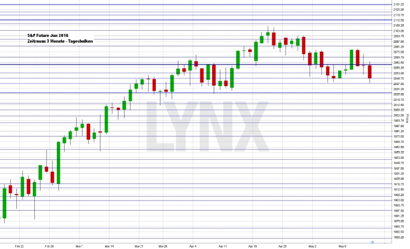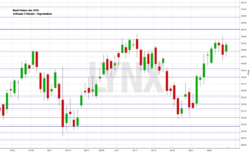 Das japanische BIP für das erste Quartal leitet um 01:50 Uhr den Mittwoch als Handelstag ein. Um 02:00 Uhr folgt das australische Westpac-Verbrauchervertrauen für den Mai, um 03:30 Uhr der chinesische Immobilienpreisindex für den April und der australische Lohnpreisindex für das erste Quartal. Die nicht-geldpolitische Sitzung der EZB beginnt um 09:00 Uhr, die britischen Arbeitsmarktdaten mit der Arbeitslosenquote, den Durchschnittseinkommen, der Erwerbstätigenquote und mehr für März/April stehen um 10:30 Uhr zur Bewertung an. Die April-Verbraucherpreise für die Eurozone werden um 11:00 Uhr veröffentlicht, die US-MBA-Hypothekenanträge um 13:00 Uhr. Das Conference Board gibt um 15:30 Uhr seinen britischen Leitindex für den April aus, das Pendant für Australien im März kommt um 16:30 Uhr, ebenso die wöchentlichen EIA-US-Rohöllagerbestandsdaten. Das FOMC-Sitzungsprotokoll vom 26./27.04.2016 um 20:00 Uhr wird einen genaueren Blick wert sein. Rund 100 Unternehmen legen ihre aktuellen Quartalszahlen und Jahresergebnisse vor, darunter Staples (USA), Cisco Systems (USA), salesforce.com (USA), Target (USA), Urban Outfitters (USA), SAB Miller (GB), Burberry Group (GB) und Crop Energies (D).