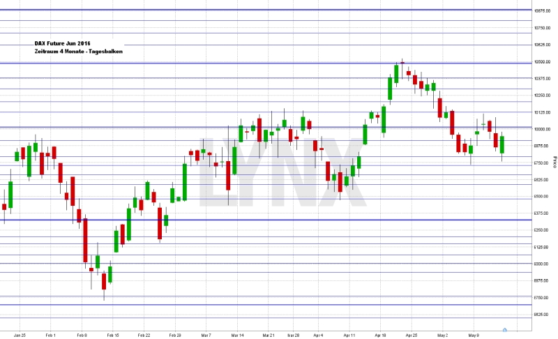 Für den DAX bleibt das Börsenjahr 2016 eine Achterbahnfahrt der Gefühle. Auch am Donnerstag konnte sich der DAX nach einer rund 240-Punkte-Handelsspanne nicht lange im fünfstelligen Bereich halten, brach abermals ein und schloss mit einem Minus von 1,13 Prozent. Nochmals stellte die 10.100-Punkte-Barriere einen zu großen Widerstand dar. Auch am Freitag war die Handelsspanne mit 211,99 Indexpunkten nicht wesentlich niedriger. Beim deutschen Leitindex standen per Xetra-Schluss 9.952,90 Punkte auf der Kurstafel. Der XDAX notierte um 22:15 Uhr mit 9.882,25 Punkten erneut tiefer. An der Wall Street beendete der Dow Jones den Handelstag mit 17.535,32 Punkten, die Rekordmarke liegt hier bei 18.351,36 Punkten. Der NASDAQ 100 notierte zum Handelsschluss bei 4.326,531 Punkten. Der breit gefasste S&P 500 schloss mit 2.046,61 Zählern, der Rekord beträgt 2.134,72 Punkte. Der Euro notierte nach US-Börsenschluss bei 1,1309 US-Dollar. Eine Feinunze Gold war am Spotmarkt für 1.273,45 US-Dollar zu haben, Rohöl der Nordseesorte Brent kostete zum US-Handelsschluss im Juli-Kontrakt 47,83 US-Dollar das Fass. Der Euro-Bund-Future notierte am Freitag an der EUREX mit einem Schlusskurs von 164,28 Zählern. Bundesanleihen bis zu einer neunjährigen Laufzeit werden negativ verzinst. Die Rendite für zehnjährige Bundesanleihen liegt aktuell bei 0,12 Prozent. Der Spread zwischen zehnjährigen deutschen Bunds und zehnjährigen US-Staatsanleihen (1,70 Prozent Rendite) liegt derzeit bei 158 Basispunkten. In der neuen Handelswoche begibt die Finanzagentur des Bundes am Mittwoch, den 18.05.2016 Kapitalmarktinstrumente (Bund) mit einer zehnjährigen Laufzeit und einem Emissionsvolumen von 4,0 Mrd. Euro (Aufstockung).