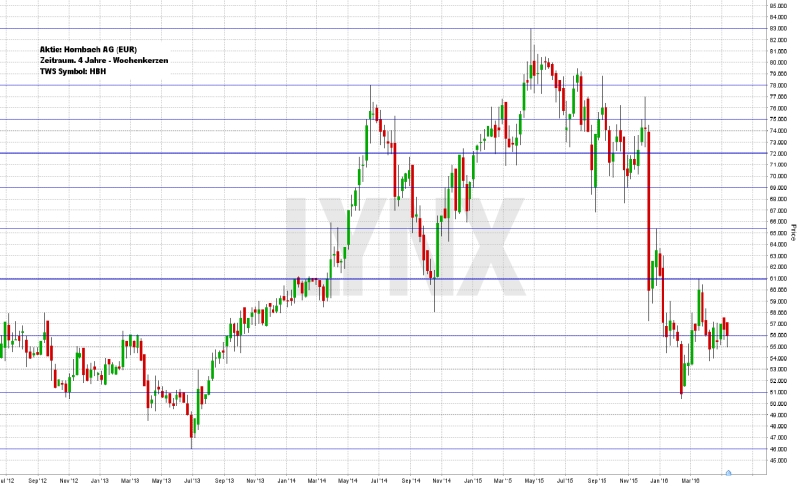 Die Aktie der Hornbach Holding AG & Co. KGaA zeigte in den vergangenen Jahren alle denkbaren Trendfacetten, wobei ein sinnvoller Trendhandel nur bedingt erfolgreich hätte umgesetzt werden können. Lediglich die Aufwärtsbewegung von Mitte 2013 bis Mitte 2014 hätte aufgrund ihres Aufbaus und ihrer Struktur recht gute Ergebnisse liefern können. Alle weiteren Bewegungen auf dem Weg zum aktuellen Fünfjahreshoch von rund 83,00 Euro waren von recht kurzfristiger Natur, sodass trendfolgende Ansätze oft ins Leere gelaufen wären. Auch die recht große Volatilität der Aktie an sich vereinfacht den Handel nicht gerade. Mit Blick auf die Abwärtsbewegung der letzten Monate lässt sich aus charttechnischer Sicht aktuell kein Kauf empfehlen. Eine Folge fallender Hochs und fallender Tiefs spricht vorerst eher für ein weiteres Fallen als für eine vorteilhafte Chance auf der Käuferseite. Erst ein Überschreiten des Widerstandes von 61,00 Euro wäre ein erstes Anzeichen für eine Trendwende, wobei eine erneute Analyse erfolgen sollte.