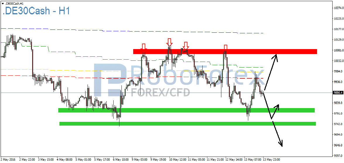 Dieses Bild spiegelt sich auch im H4-Chart und der vergangenen Handelswoche wider. Drei Anläufe unternahm der Markt auf die 10.100 Punkte-Marke. Doch wie auch in der zweiten März-Hälfte ist dieser Widerstand für den DAX eine Nummer zu stark. Daraus resultierte unter der Woche eine Topbildung in diesem Bereich und im Hinblick auf das lange Pfingstwochenende nahm die Vorsicht der Anleger überhand. Für Anleger gab es zum Wochenschluss keine ausreichenden bullishen Signale um das Risiko für das lange Wochenende zu erhöhen. Eine defensivere Positionierung und damit leichtere Notierungen zum Wochenende kamen daher nicht überraschend. Auf der Unterseite rückt dadurch vermehrt die Unterstützung bei 9.730 Punkten in den Fokus. Sollte diese Marke im Verlauf der kommenden Handelswoche unterschritten werden, würde sich ein neuer Abwärtstrend im mittelfristigen Bereich etablieren und Anleger müssten als nächstes die Unterstützung bei 9.400 Punkten ins Visier nehmen.