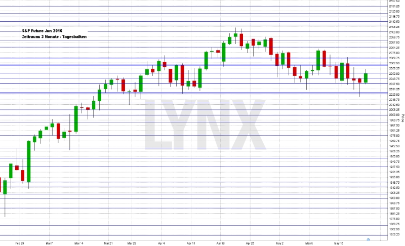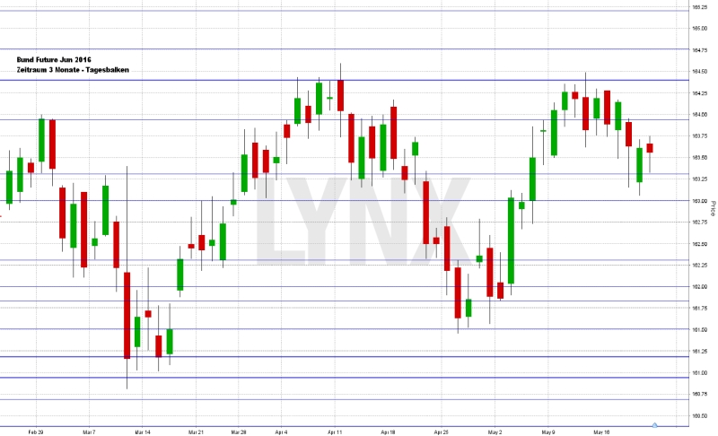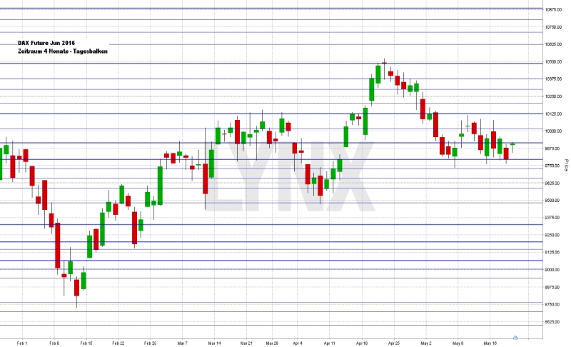 Der deutsche Leitindex DAX bewegt sich übergeordnet seitwärts. Die Handelswoche beendete er mit einem Minus von 0,37 Prozent. Bereits am Donnerstag wurde die Hoffnung, sich endlich oberhalb der wichtigen technischen Schaltstelle von 10.100 Punkten abzusetzen, nicht erfüllt. Ein weiteres Mal prallte der DAX von dieser Marke nach unten ab. Am Freitag schloss er per Xetra-Schluss bei 9.916,02 Indexpunkten. Der XDAX notierte um 22:15 Uhr mit 9.912,88 Punkten. An der Wall Street beendete der Dow Jones den Handelstag mit 17.500,94 Punkten, die Rekordmarke liegt hier bei 18.351,36 Punkten. Der NASDAQ 100 notierte zum Handelsschluss bei 4.362,903 Punkten. Der breit gefasste S&P 500 schloss mit 2.052,32 Zählern, der Rekord beträgt 2.134,72 Punkte. Der Euro notierte nach US-Börsenschluss bei 1,1224 US-Dollar. Eine Feinunze Gold war am Spotmarkt für 1.251,98 US-Dollar zu haben, Rohöl der Nordseesorte Brent kostete zum US-Handelsschluss im Juli-Kontrakt 48,72 US-Dollar das Fass. Der Euro-Bund-Future notierte am Freitag an der EUREX mit einem Schlusskurs von 163,63 Zählern. Bundesanleihen bis zu einer achtjährigen Laufzeit notieren mit einem Negativzins. Die Rendite für zehnjährige Bundesanleihen liegt aktuell bei 0,16 Prozent. Der Spread zwischen zehnjährigen deutschen Bunds und zehnjährigen US-Staatsanleihen (1,84 Prozent Rendite) liegt derzeit bei 168 Basispunkten. In der neuen Handelswoche begibt die Finanzagentur des Bundes am Montag, den 23.05.2016 Geldmarktinstrumente (Bubill) mit einer einjährigen Laufzeit und einem Emissionsvolumen von 1,5 Mrd. Euro (Neuemission) sowie am Mittwoch, den 25.05.2016 Kapitalmarktinstrumente (Bund) mit einer dreißigjährigen Laufzeit und einem Emissionsvolumen von 1,0 Mrd. Euro (Aufstockung).