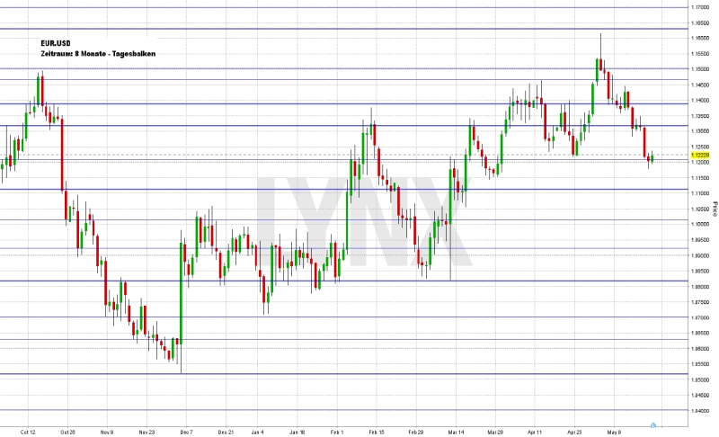 Die Annahme, dem EUR.USD fehle die Kraft für einen weiteren Anstieg, hat sich bewahrheitet. Der Markt sackte zeitweise bis unter die Marke 1,1200 ab. Gerade der Mittwoch bot gute Chancen für kleinere Daytrades nach unten. Der Freitagsschlusskurs lag im Bereich 1,1220, etwa 100 Ticks tiefer als in der Vorwoche. Charttechnisch stellt sich die Situation beim EUR.USD aktuell sehr unsauber dar. Mit dem Unterschreiten des Tiefs von Ende April ist die saubere Frequenz steigender Hochs und steigender Tiefs gebrochen, was kein gutes Zeichen für die Long-Seite ist. Käufe sind somit aktuell weniger interessant. Auf der Abwärtsseite könnte es eventuell zu einer weiteren Bewegung in Richtung 1,1100 kommen, wobei dieser Annahme ebenfalls nicht zu viel Aufmerksamkeit geschenkt werden sollte. Wie in den anderen Märkten auch ist Zurückhaltung nicht zwingend verkehrt.