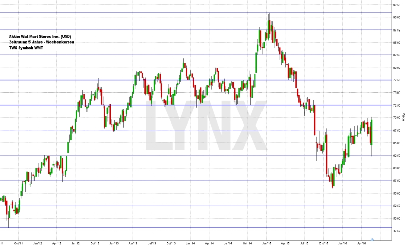 Der Fünfjahreschart der Aktie von Wal-Mart Stores Inc. teilt sich relativ eindeutig in zwei Phasen: Von Ende 2011 bis Ende 2014 lag der Vorteil des Wertes überwiegend auf der Long-Seite und die Aktie stieg von rund 48,00 bis hinauf auf über 90,00 US-Dollar. Trotz zwischenzeitlicher Seitwärtsphasen hätten Käufe überwiegend gute Chancen gehabt. Seit Anfang 2015 setzte dann eine verhältnismäßig starke Abwärtsbewegung ein, welche den Wert in nur knapp einem Jahr wieder hinab bis auf rund 57,00 US-Dollar brachte. Seit Anfang diesen Jahres setzte erneut eine Aufwärtsbewegung ein und die Wal-Mart-Aktie tendiert wieder um die Marke von 70,00 US-Dollar. Trotz der bisherigen Stärke in diesem Jahr stellt sich das langfristige Chartbild des Wertes noch nicht auf die Käuferseite. Zu stark war die Abwärtsbewegung 2015. Erst Kurse oberhalb von 72,50 beziehungsweise 77,50 US-Dollar würden wieder eher für Käufe sprechen. Etwas kurzfristiger gesehen könnte die Long-Seite jedoch ein gewisses Potenzial haben, Ziele in Richtung 72,50 oder auch 75,00 US-Dollar sind durchaus realistisch. Vorsicht jedoch in Bezug auf sinnvolle Stoppunkte und das Tief der vergangenen Handelswoche.