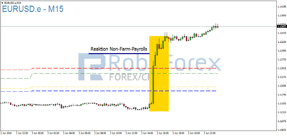 Auf dem M15-Chart wird das Ausmaß der Bewegung nochmal besonders deutlich. Kursschwankungen des EUR/USD vor Veröffentlichung der US-Arbeitsmarktzahlen sind nur unwesentlich zu erkennen. Hier lässt sich gut erkennen was passiert, wenn der Markt überrascht wird und plötzlich ein besonders hohes Volumen auftritt und alle in den Markt rein oder raus wollen. Solange man auf der richtigen Seite steht, ist alles in Ordnung. Wenn dies aber nicht der Fall ist, ist ein gutes Krisenmanagement angesagt.