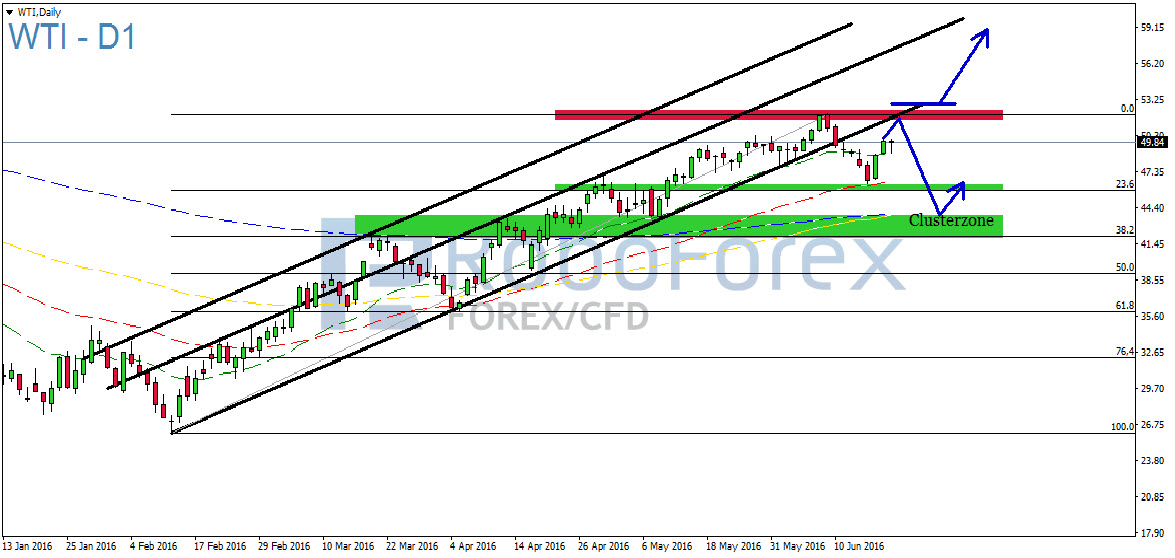 Im gestrigen Handelsverlauf kam der Barrelpreis für WTI allerdings wieder zwischenzeitlich unter Druck. Dies spricht dafür, dass es sich bei Aufwärtsbewegung zu Wochenbeginn lediglich um eine Erholung in der Abwärtsbewegung gehandelt hat und das Ende der Fahnenstange noch nicht erreicht ist. Weitere Rücksetzer können daher auch bei einem Verbleib der Briten in der EU zumindest nicht gänzlich ausgeschlossen werden.
