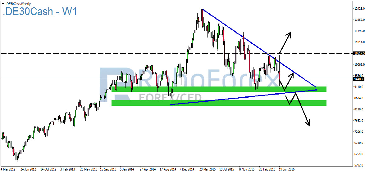 Auf Wochenbasis hat sich aus charttechnischer Sicht nichts Relevantes auf der Shortseite ergeben. Die wichtigsten Unterstützungsbereiche haben trotz des Sell-Off´s am Freitag gehalten. Vielmehr hat der DAX im Wochenverlauf vor dem Referendum angedeutet, in welche Richtung es gehen kann. Auf der Oberseite konnte die langfristige Abwärtstrendlinie gebrochen werden. Es ist davon auszugehen, dass bei einem Abstimmungsergebnis der Briten pro EU die Abwärtstrendlinie auch nachhaltig auf Wochenbasis erfolgt wäre. Dies wäre ein wichtiges bullishes Signal gewesen und hätte für die kommenden Handelswochen die Richtung vorgegeben.