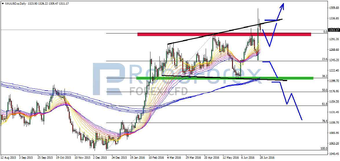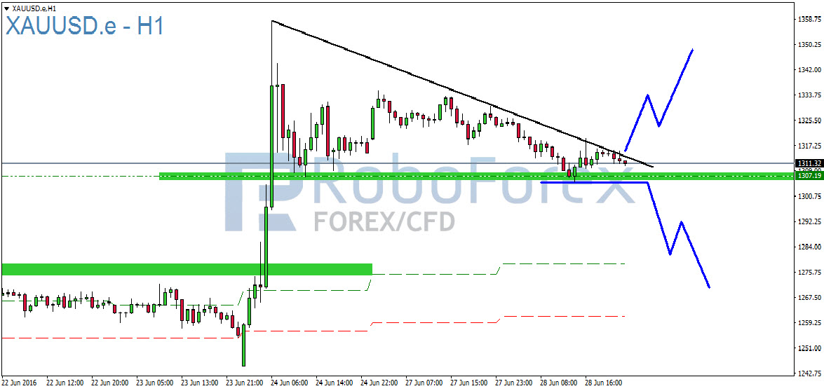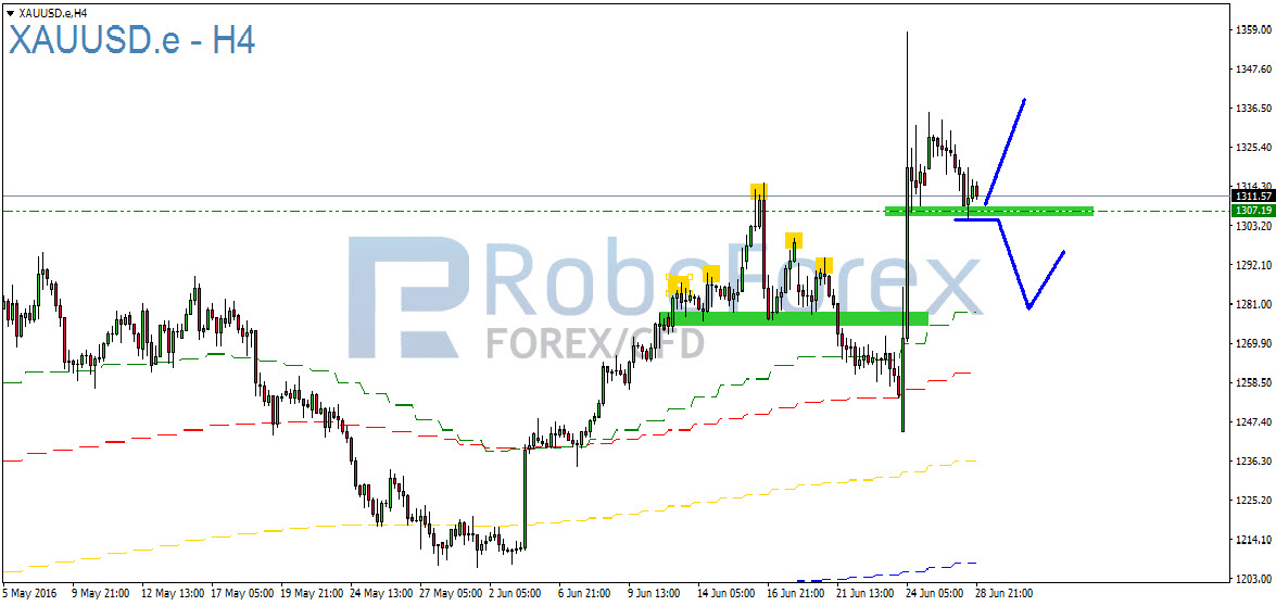 Trotz der erhöhten Nachfrage am Freitag auf Grund des überraschend ausfallenden Referendums konnte Gold nicht dynamisch aus der Konsolidierungsformation auf Tagesbasis ausbrechen. An der oberen Trendlinie bei 1.334,- USD fand Gold am Freitag sein Tages- und Wochenhoch. Auch am Montag konnte dieses Hoch nicht mehr überwunden werden obwohl die weltweiten Aktienmärkte weiter Schwäche zeigten und mit weiteren Verlusten in die aktuelle Handelswoche gestartet waren.