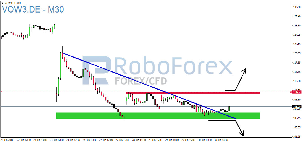 Aus dem charttechnischen Blickwinkel bieten sich bei einem nachhaltigen bullishen Ausbruch im M30-Chart gute Einstiegschancen. Dieser wäre mit einem Schlusskurs über 111.30 EUR gegeben. In diesem Fall hätte die VW-Aktie durchaus Potenzial bis 117,50 EUR, 129,- EUR und 138,- EUR. Ein Stopp bei 100,- EUR würde diese Position mit einem guten CRV absichern.