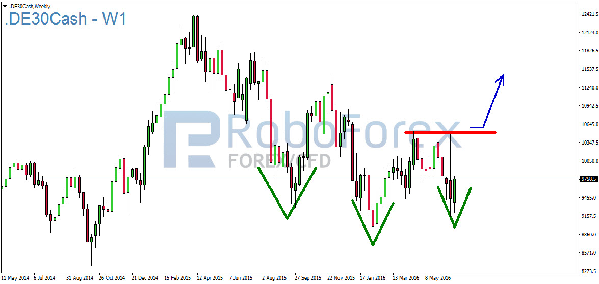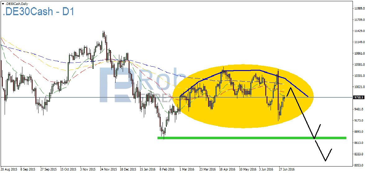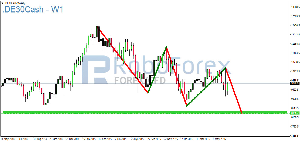 Zum einen besteht die Möglichkeit, dass wir im DAX von Februar bis Mai nur eine Korrektur der vorangegangenen Abwärtsbewegung gesehen haben. Diese Korrektur hätte bei 10.500 Punkten ihr Limit erreicht (doppelt getestet) und durch den Brexit wäre jetzt eine neue übergeordnete Abwärtsbewegung eingeleitet worden. Diese Abwärtsbewegung hätte ihr Kursziel zunächst bei 8.700 Punkten und im Anschluss 8.300 Punkten. Von dort bestünde dann aber durchaus die Möglichkeit, einen neuen Bullenmarkt zu starten.