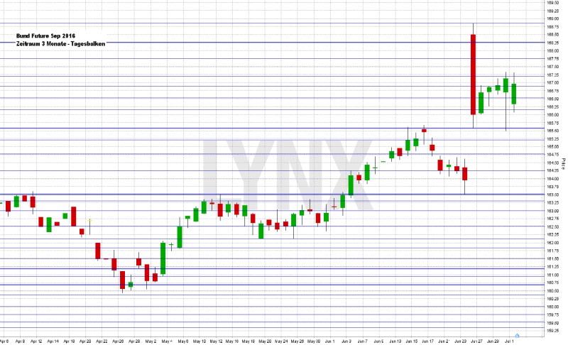 Die Ankündigung weiterer Stimuli seitens der Bank of England (BoE) und der EZB befeuert kurzfristig europäische Aktien. Der deutsche Leitindex DAX ging am Freitag mit 9.776,12 Punkten aus dem Xetra-Handel. Der erste Handelstag des Juli, des neuen Quartals und des neuen Halbjahrs endete für den DAX mit einem Plus von 0,99 Prozent. Die Aktienmärkte erholten sich seit dem Brexit zwar von ihren teils immensen Abgaben, dennoch bleibt die Nachfrage nach sicheren Häfen wie Bundesanleihen und Gold hoch. Der XDAX notierte um 22:15 Uhr bei 9.744,07 Punkten. An der Wall Street beendete der Dow Jones den Handelstag mit 17.949,37 Punkten, die Rekordmarke liegt hier bei 18.351,36 Punkten. Der NASDAQ 100 notierte zum Handelsschluss bei 4.437,445 Punkten. Der breit gefasste S&P 500 schloss mit 2.102,95 Zählern, der Rekord beträgt 2.134,72 Punkte. Der Euro notierte nach US-Börsenschluss bei 1,1136 US-Dollar. Eine Feinunze Gold war am Spotmarkt für 1.341,35 US-Dollar zu haben, Rohöl der Nordseesorte Brent kostete zum US-Handelsschluss im August-Kontrakt 49,68 US-Dollar das Fass. Der Euro-Bund-Future notierte am Freitag an der EUREX mit einem Schlusskurs von 167,07 Zählern. Die Rendite für zehnjährige Bundesanleihen liegt aktuell bei -0,13 Prozent. Der Spread zwischen zehnjährigen deutschen Bunds und zehnjährigen US-Staatsanleihen (1,44 Prozent Rendite) liegt damit bei 157 Basispunkten. In der neuen Handelswoche begibt die Finanzagentur des Bundes am 05.07.2016 Kapitalmarktinstrumente (iBund) mit einer dreißigjährigen Laufzeit und einem Emissionsvolumen von 0,5 Mrd. Euro (Aufstockung) und Kapitalmarktinstrumente (Schatz) mit einer zweijährigen Laufzeit und einem Emissionsvolumen von 4,0 Mrd. Euro (Aufstockung).
