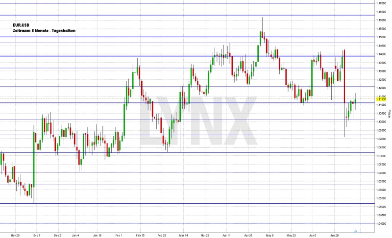 Nach dem sehr starken Abwärts-Move vom vorletzten Freitag eröffnete der EUR/USD am Montag erneut etwas tiefer bei gut 1,1000. Im Laufe der Handelswoche stellte sich dann eine leichte Erholung ein, welche den Markt bis Freitag wieder hinauf auf gut 1,1150 führte. Der Wochenschlusskurs lag erneut im Korridor 1,1100 bis 1,1400 bei rund 1,1125. Die empfohlene Handlungspause war aufgrund der Unvorhersehbarkeit der Bewegungen nicht verkehrt. Mit dem erneuten Sprung in den Bereich zwischen 1,1100 und 1,1400 befindet sich der Markt einmal mehr in dem schon oft angesprochenen Seitwärtsbereich, was generell zu einer erhöhten Vorsicht führen sollte. Es wäre aus aktueller Sicht jedoch denkbar, bei Kursen oberhalb von 1,1100 den Markt in Richtung 1,1200 beziehungsweise 1,1250 zu handeln. Ein erneutes Absacken unter 1,1100 könnte den Markt nochmals in Richtung 1,1000 führen.