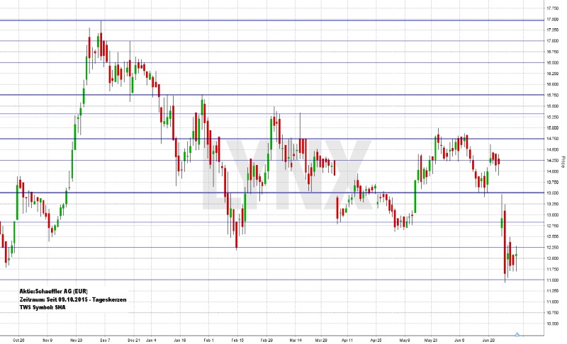 Die Aktie von Schaeffler entwickelte sich von Oktober bis Dezember letzten Jahres recht gut und stieg von etwa 13,00 Euro auf knapp 17,50 Euro. In den folgenden Monaten entwickelte sich der Wert jedoch weniger positiv und sackte kürzlich auf ein Allzeittief von knapp 11,50 Euro ab, nachdem sich von Februar bis Mai eine Seitwärts-Range von 12,75 bis 14,75 Euro ausgebildet hatte. Charttechnisch auffällig ist eine Abwärtsbewegung Ende Juni. Ausgehend von einem Gap von gut 14,00 Euro auf unter 12,75 Euro sackte der Wert mit einer starken Bewegung bis auf das erwähnte Tief. Der Schlusskurs der vergangenen Woche lag mit gut 12,00 Euro nicht nennenswert höher. Charttechnisch stehen die Vorzeichen für die kommenden Handelswochen eher auf rot als auf grün. Weitere Tiefs sind nicht auszuschließen, was Käufe sehr uninteressant werden lässt. Erst ein Überschreiten der Marke von 13,50 Euro könnte der Aufwärtsseite eventuell wieder eine realistische Chance und einen ausnutzbaren Vorteil bescheren, wobei eine erneute Analyse sinnvoll wäre. Zu stark waren die Bären seit Dezember letzten Jahres.