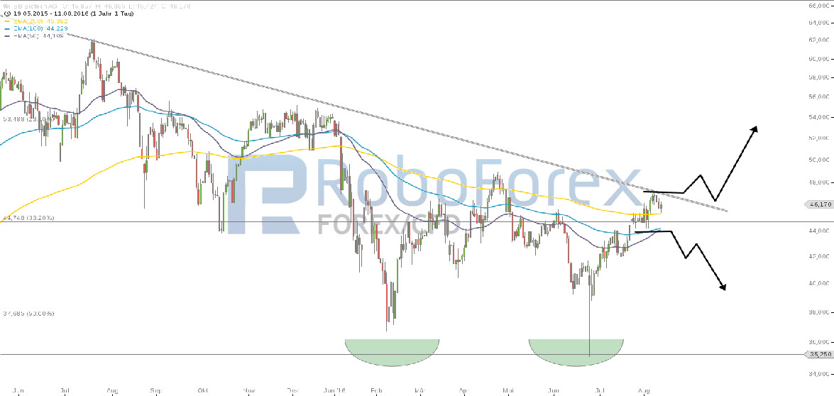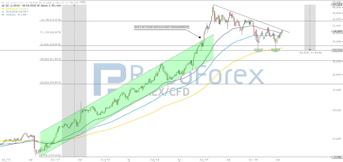 Die Aktie der Biotechnologie-Beteiligungsgesellschaft BB Biotech befindet sich seit ihrem Hoch im März 2015 bei 68,- EUR in einem intakten übergeordneten Abwärtstrend. Aufgrund der vorangegangenen Boomphase, in der die Aktie von 2011 bis 2015 um unglaubliche 773% zulegen konnte, ist eine Korrektur allerdings als gesund einzustufen. Diese Korrektur geht mit einer Schwäche des gesamten Biotech-Sektors einher und ist damit auch aus fundamentaler Sicht gerechtfertigt. Für das I. und II. Quartal 2016 wies das Unternehmen einen Milliardenverlust auf. Unter dem Strich resultierte für die ersten sechs Monate ein Verlust von 1.17 Milliarden CHF. Der Halbjahresverlust ist auf die negativen Vorgaben des ersten Quartals zurückzuführen. Im 2. Quartal des Jahres habe sich der Biotech-Sektor dagegen beruhigt.