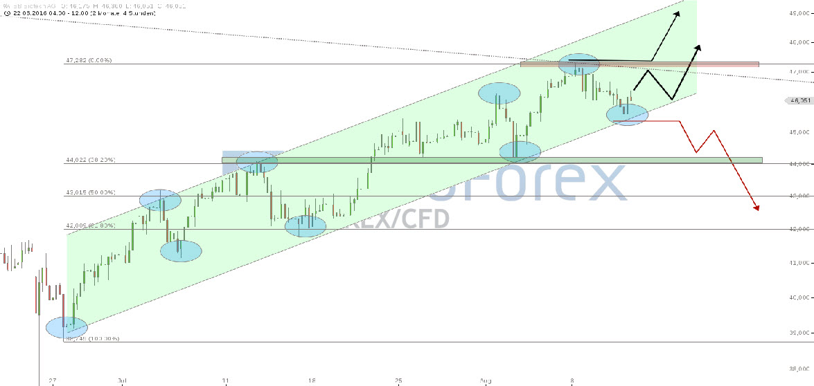 Der H4-Chart zeigt derzeit für die Aktie von BB Biotech einen stabilen Aufwärtstrend an. Dieser zeichnet sich durch ansteigende Hoch- und Tiefpunkte (blaue Ellipsen) aus. Gleichzeit lassen sich die temporären Hoch- und Tiefpunkte in einem Trendkanal darstellen.